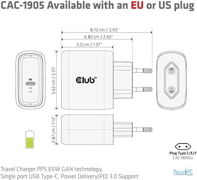 Hálózati töltő, 1xUSB-C, Kábel csatlakozó USB-C , 5V/9V, 3A, 65W, PD, Black