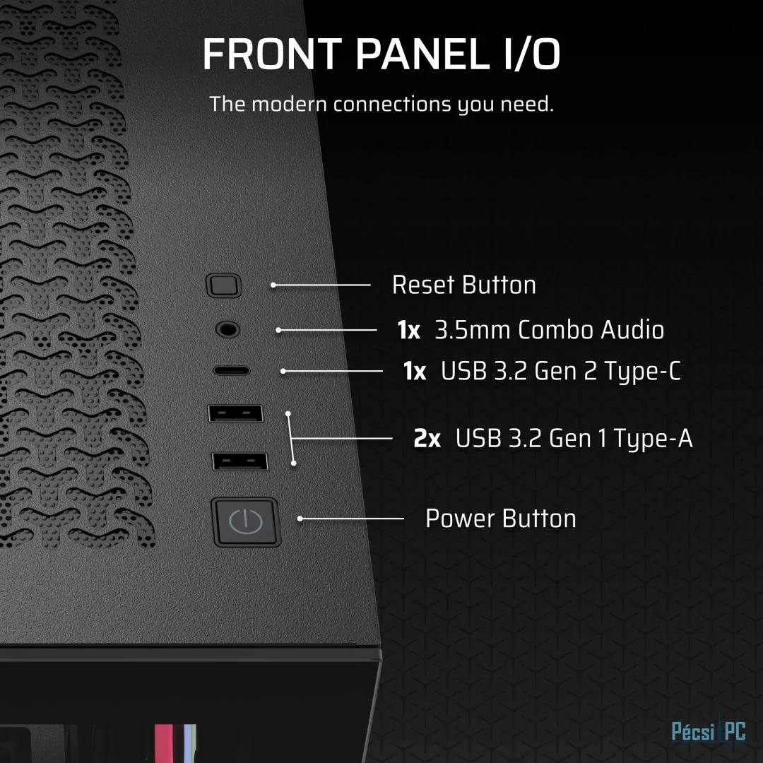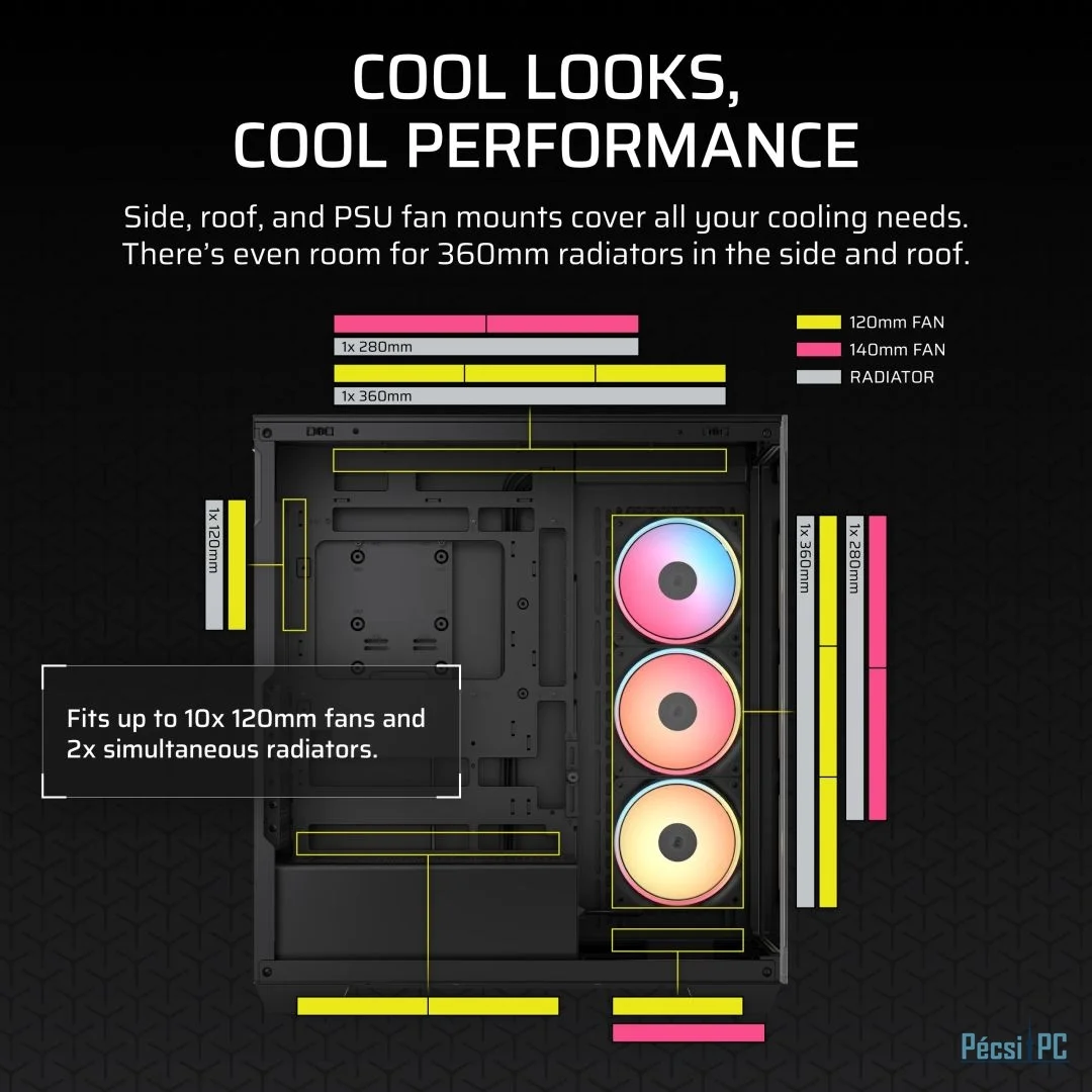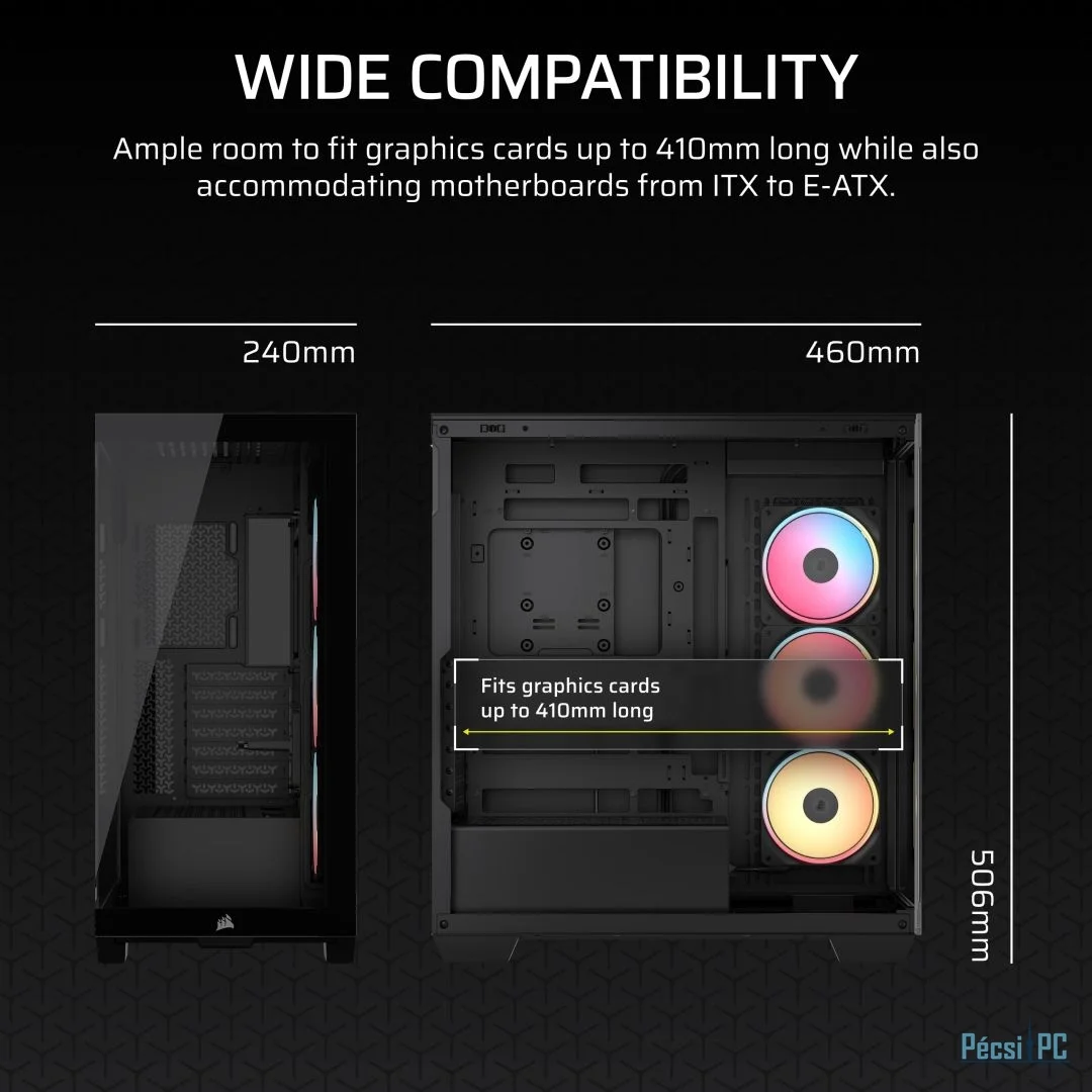 E-ATX, Black, 2x3,5", 2x2,5", 2xUSB3.2, 1xUSB Type-C, Audio, Táp nélkül, 506x460x240mm, Ventilátor:3x12cm, Tempered glass window, RGB, Gamer