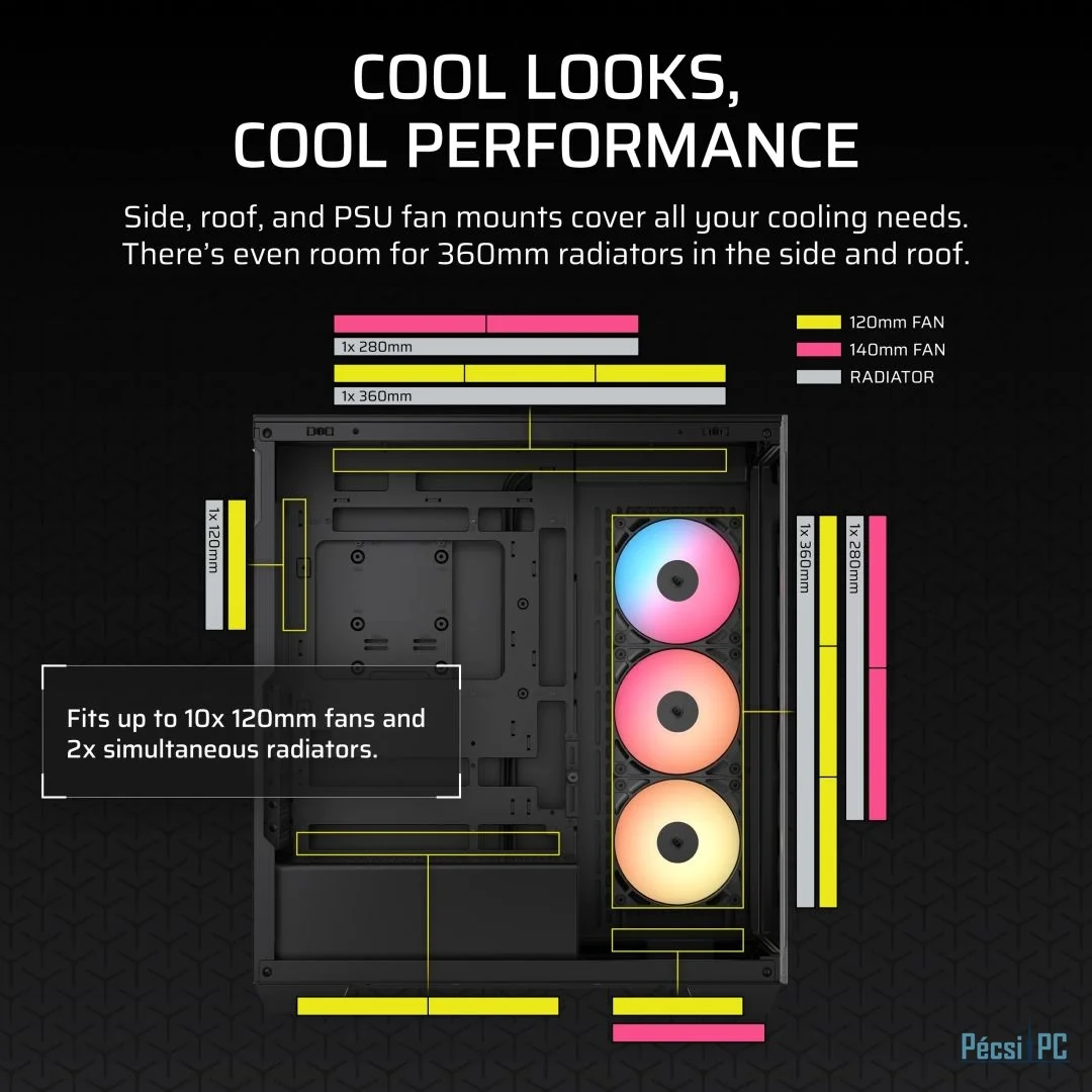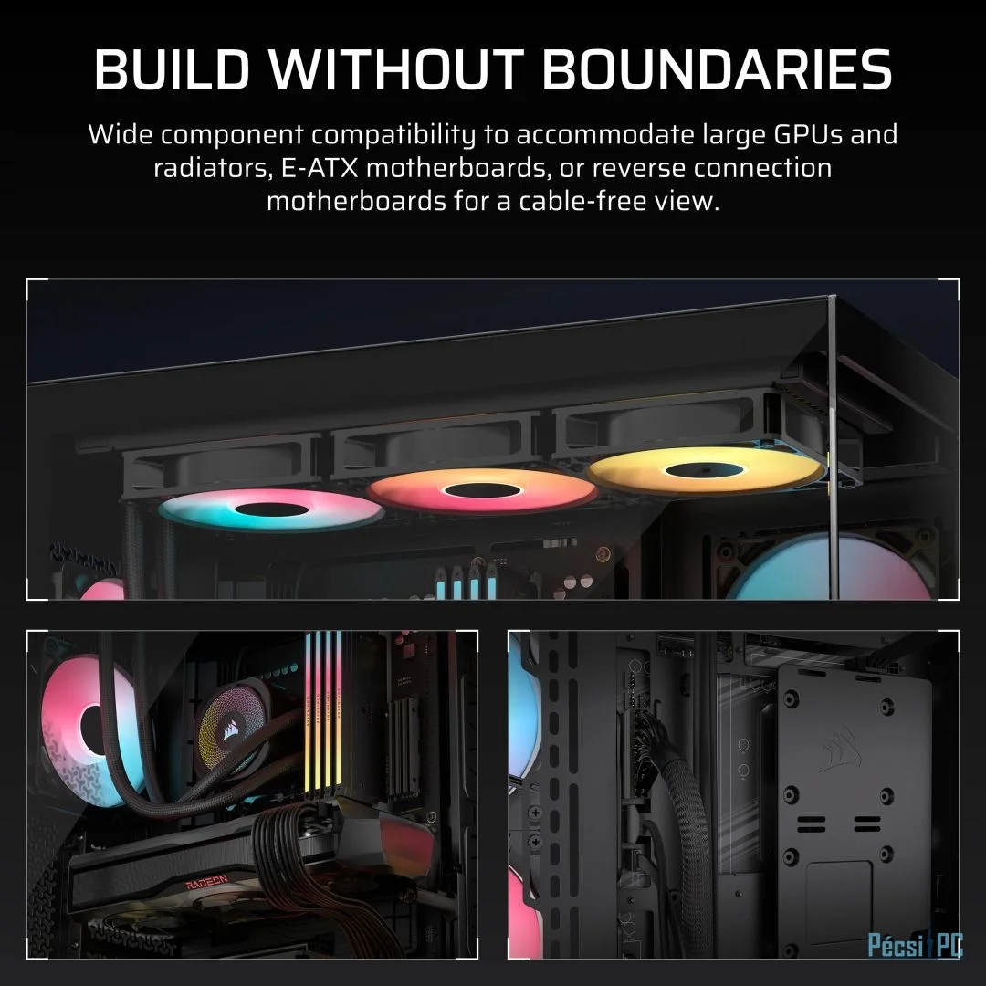 E-ATX, Black, 2x3,5", 2x2,5", 2xUSB3.2, 1xUSB Type-C, Audio, Táp nélkül, 506x460x240mm, Ventilátor:3x12cm, Tempered glass window, RGB, Gamer