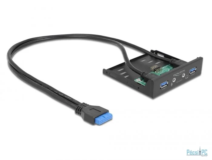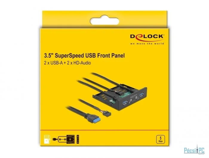 Ez a Delock elülső panel egy számítógép szabad, 3.5″ bővítőhelyére telepíthető. Két USB 3.2 Gen 1-s és két HD-Audio-porttal rendelkezik. A csatlakozókábeleket belül kell csatlakoztatni az alaplaphoz.