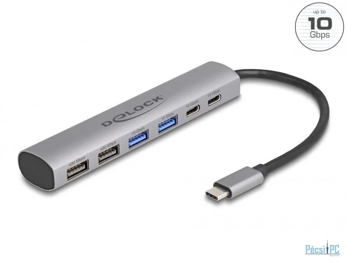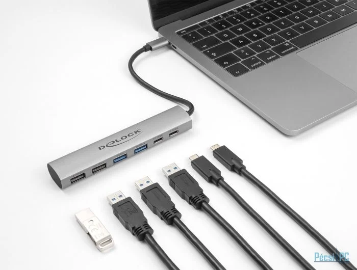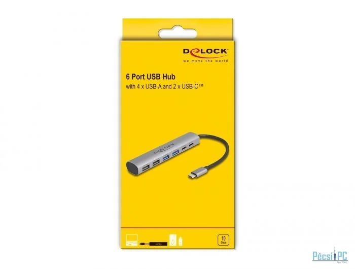 Ez a Delock USB-elosztó USB Type-C™ csatolón keresztül asztali vagy hordozható számítógéphez csatlakoztatható. Rendelkezik 4 A-típusú és 2 USB Type-C™ csatlakozó felülettel. Igény szerint különféle USB-eszközöket, például dokkolóállomásokat, kártyaolvasót, külső házat stb. csatlakoztathat.