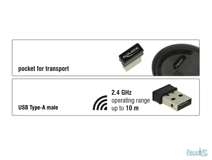 Vezeték nélküli, Wireless 2,4GHz, Optikai, 1000DPI, Black, Vertikális, Csendes működés