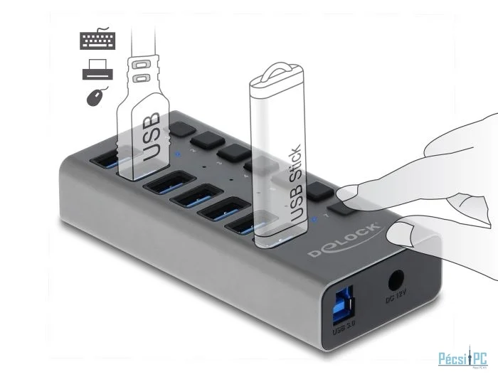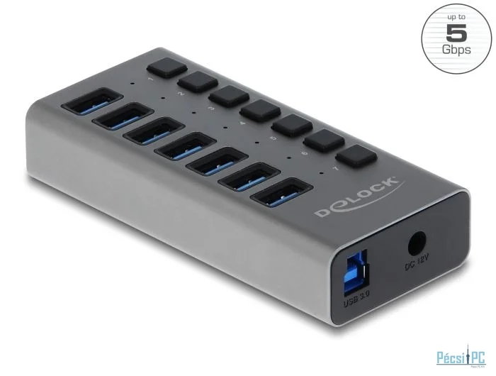 Ez a fémvázas Delock USB hub egység összeköthető egy számítógéphez A-típusú USB csatlakozó felületen keresztül. A számítógépet 7 A-típusú USB porttal egészíti ki. Eszközöket, mint például okostelefonokat rácsatlakoztatva feltöltés vagy adatátvitel valósítható meg 5 Gbps sebességgel. Minden egyes port be- vagy kikapcsolható egyesével a kapcsolók segítségével.