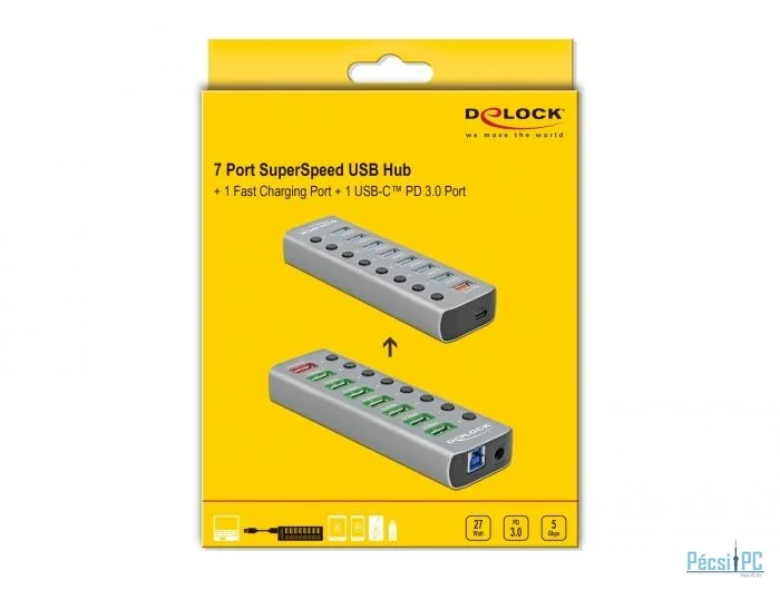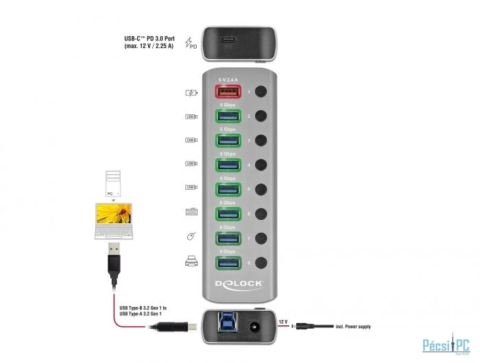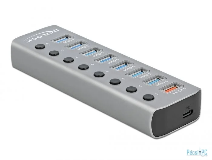 DeLock USB 3.2 Gen 1 Hub with 7 Ports + 1 Fast Charging Port + 1 USB-C PD 3.0 Port with Switch and Illumination