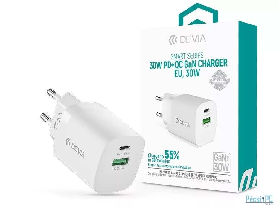 Hálózati töltő, 1xUSB-A, 1xUSB-C, 3A, 30W, QC, PD, White