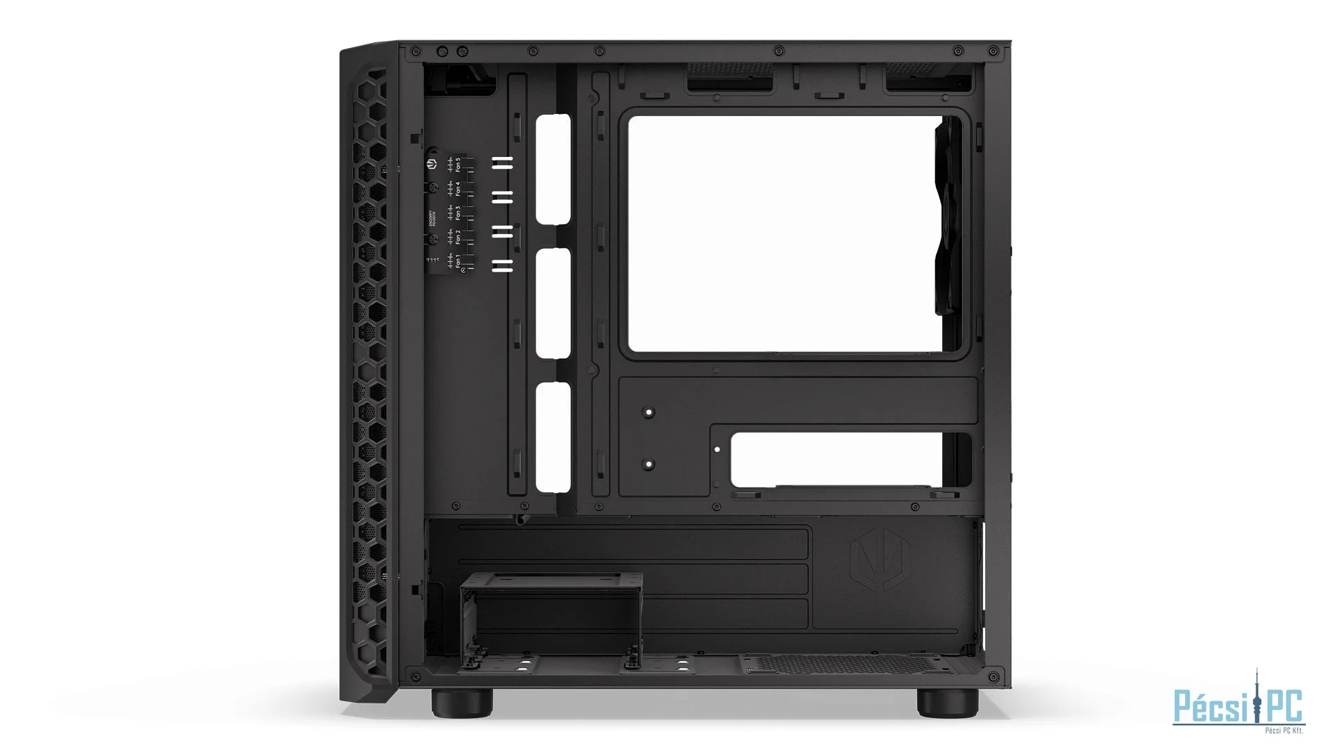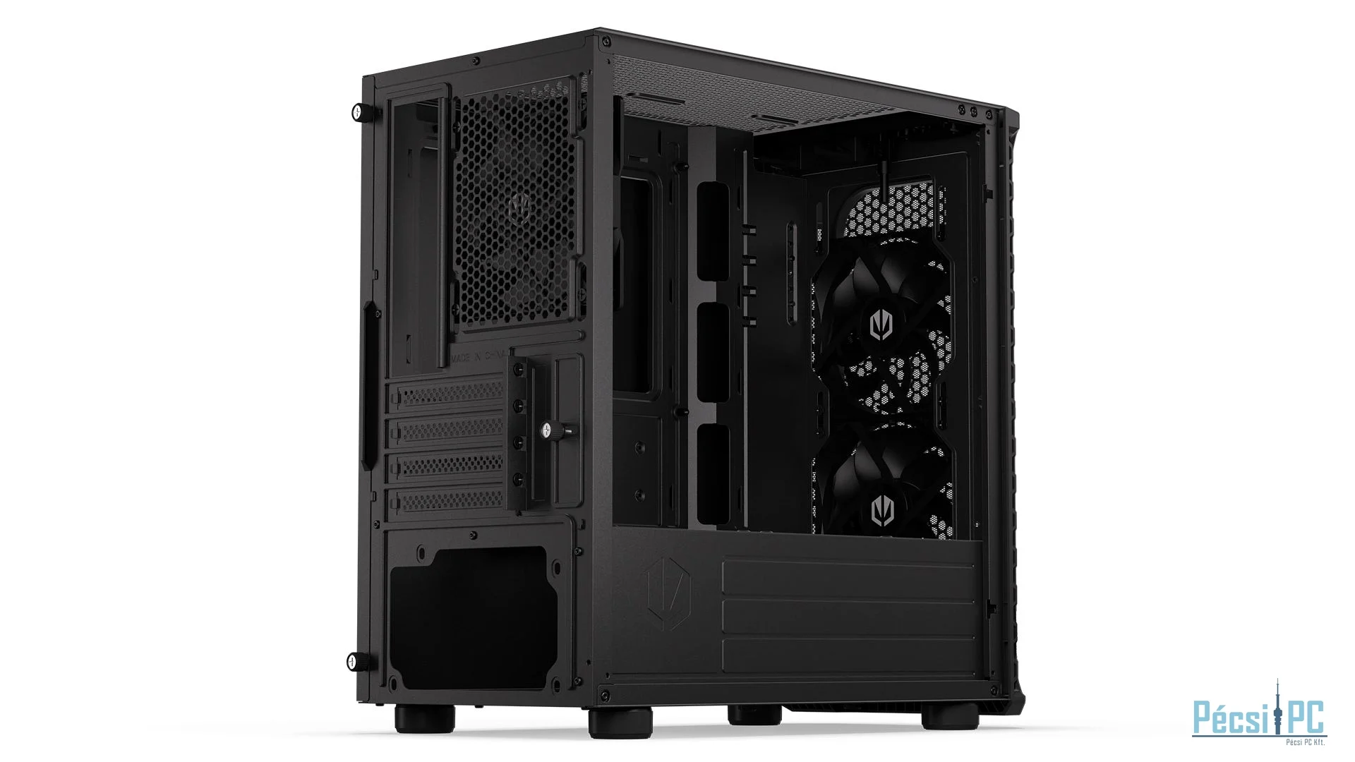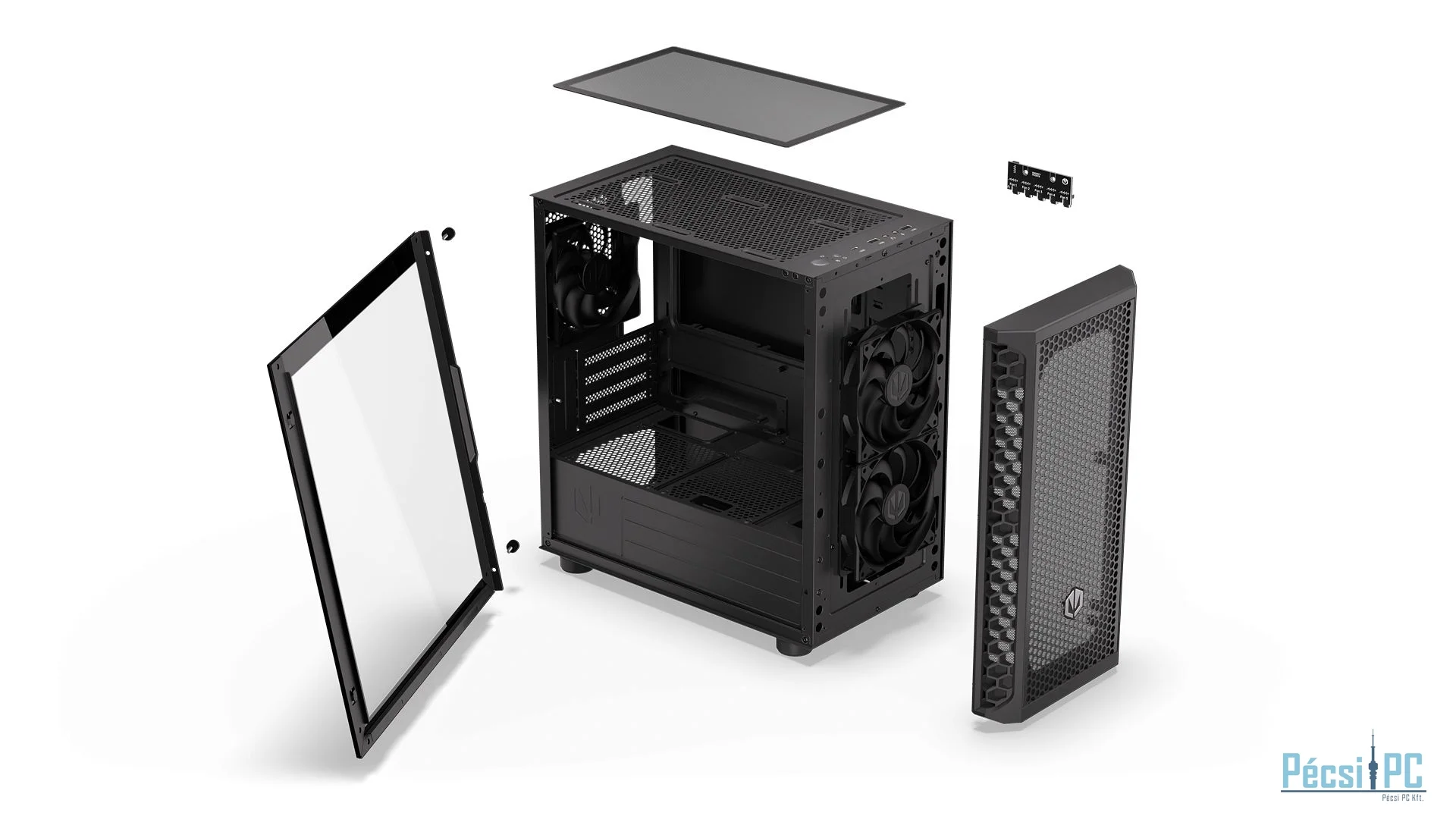 microATX, Black, 2x3,5", 2x2,5", 2xUSB3.2, 1xUSB Type-C, Audio, Táp nélkül, 401x387x205mm, Ventilátor:3x12cm, Tempered glass window