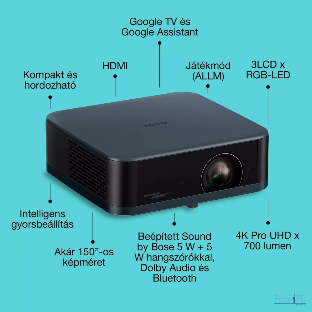 3LCD, 3840x2160, 700ANSI Lumen, 5M:1, 199x190x75mm, 1,6kg, Bluetooth, WiFi