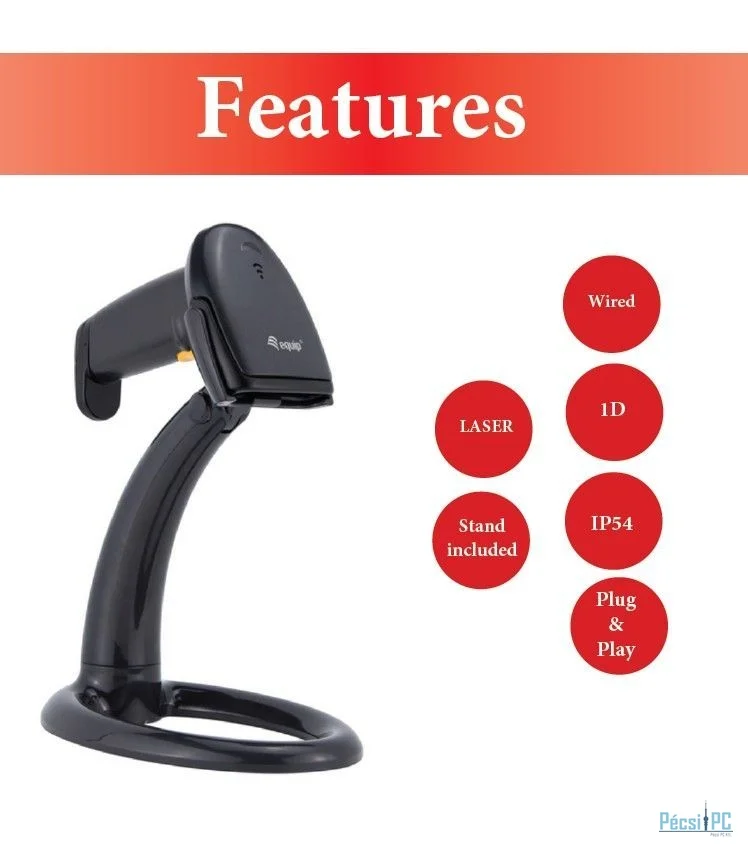 Tartalmazza a kéz nélküli állványt: Megkönnyíti a kéz nélküli működést a nagy volumenű feladatokhoz. Az Equip USB 1D lézeres vonalkódolvasó állvánnyal sokoldalú és hatékony szkennelési megoldás a vállalkozások számára. A különböző alkalmazásokhoz, például kiskereskedelemhez és leltárkezeléshez tervezett készülékhez egy kényelmes állvány tartozik a kéz nélküli működéshez, ami javítja a termelékenységet.