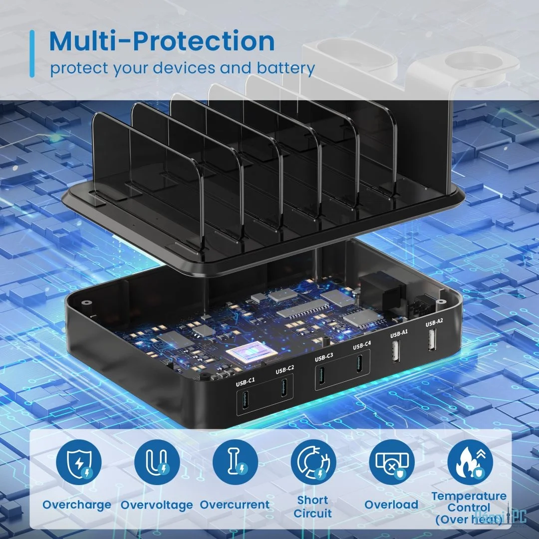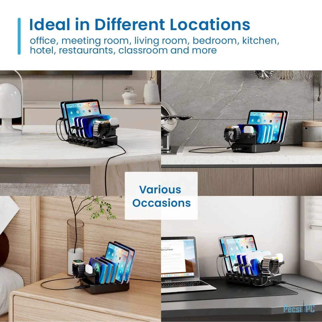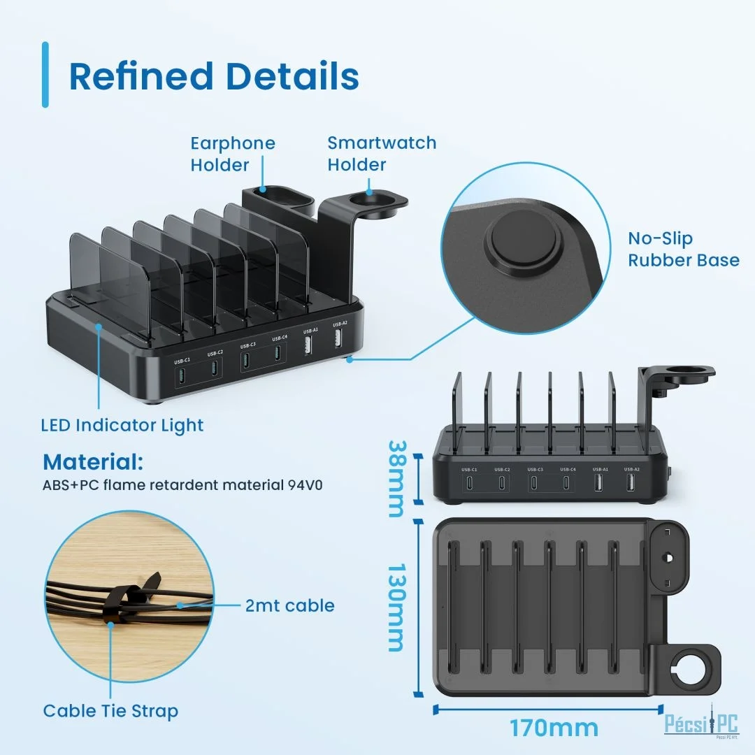 A több eszközhöz használható USB-töltőállomás 6 USB-ről tölthető eszközt tud egyszerre tölteni, beleértve okostelefonokat, táblagépeket, notebookokat, netbookokat vagy iPhone-okat, iPad-eket. Minden eszköz 1 csatlakozóval tölthető, nem kell 6 különböző aljzatot használni, így nincs rendetlenség, és az egész család időt takarít meg.