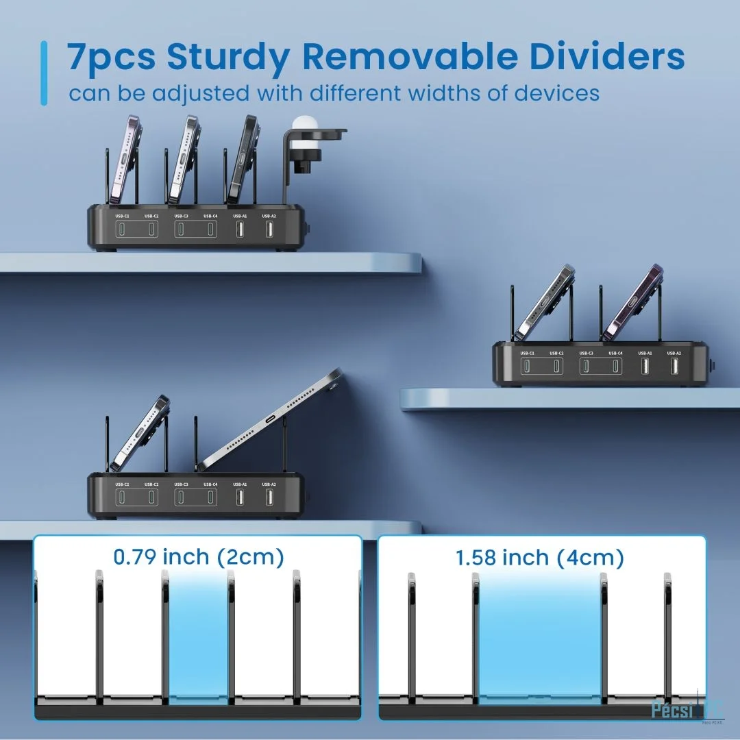 Az USB 6 töltőállomás elválasztói különböző szélességű eszközökhöz állíthatók be, és mindenféle eszközhöz konfigurálhatók. Ezután egyszerűen beállíthatja a készülék töltéséhez szükséges helyet azáltal, hogy hozzáad vagy eltávolít egy mellékelt elválasztót!
