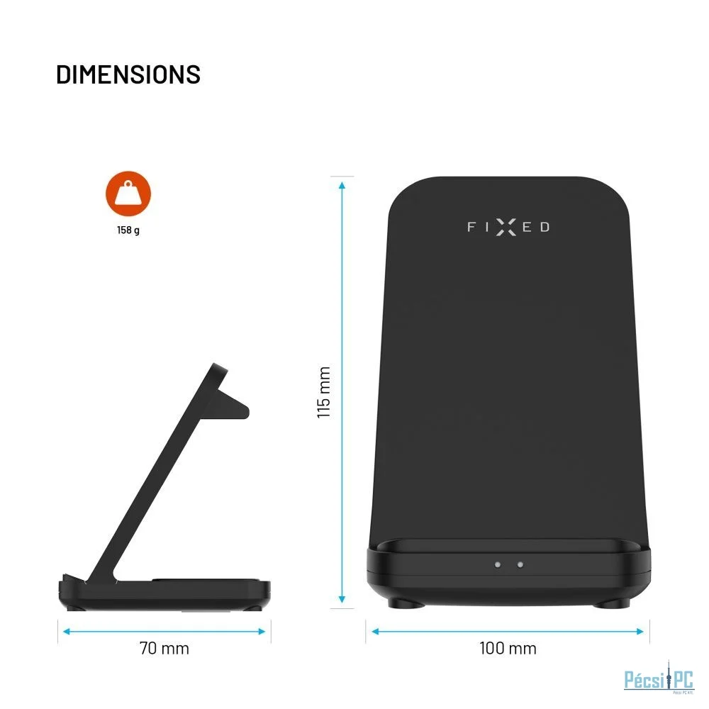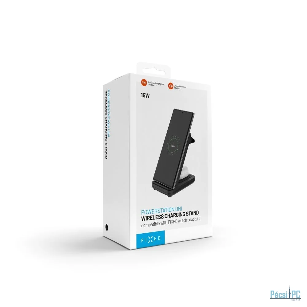 A FIXED Powerstation Uni vezeték nélküli állvány egyszerre két eszköz kényelmes töltését kínálja, és az okosórák töltőfelületével bővíthető. A fő felület támogatja a telefonok gyors töltését akár 15 W-os teljesítménnyel, és a kombinált tekercsnek köszönhetően a telefon vízszintes és függőleges helyzetben is elhelyezhető. Az akár 5 W teljesítményű második felület ideális vezeték nélküli fejhallgatók vagy más vezeték nélküli kiegészítők számára. Az állvány USB-C porttal van felszerelve, amely az Apple Watch, Garmin vagy Samsung Galaxy Watch okosórákhoz való FIXED töltőadapterrel bővíthető. A töltőfelületek puha felülete megvédi a készüléket a karcolásoktól, míg a csúszásgátló párnák biztosítják az állvány stabilitását. A maximális teljesítmény érdekében javasoljuk, hogy legalább 25 W teljesítményű PD szabványú hálózati adaptert használjon.