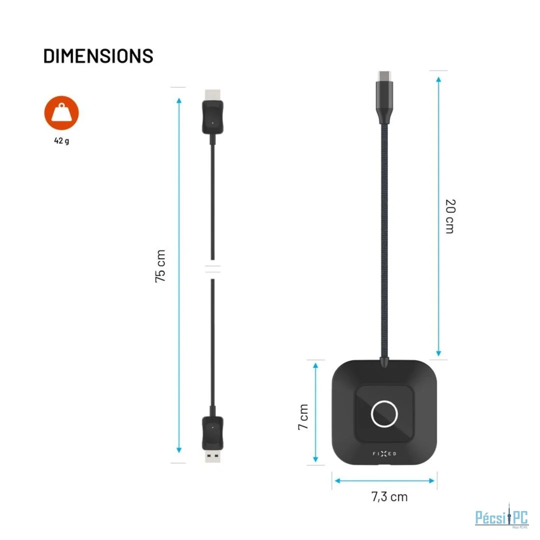 A FIXED AirLink vezeték nélküli HDMI-adapterrel könnyedén streamelhet képeket laptopjáról TV-re, monitorra vagy projektorra anélkül, hogy további kábelekre vagy alkalmazások és illesztőprogramok telepítésére lenne szükség. Egyszerűen csatlakoztassa a kompakt adót a laptop vagy más, adatátviteli funkcióval rendelkező eszköz USB-C portjához, a vevőt pedig csatlakoztassa a megjelenítő eszköz HDMI és USB portjához, és egyetlen gombnyomással párosítsa a két részt. A kapcsolat pillanatok alatt létrejön, és máris élvezheti a zökkenőmentes képtükrözést. Az adapter támogatja a Full HD 1080p felbontást 60 Hz-en, és tükrözési módot, valamint kiterjesztett asztali felületeket kínál, amit munka és szórakozás közben egyaránt értékelni fog. A minimális, legfeljebb 10 milliszekundumos késleltetésnek köszönhetően a kép gyakorlatilag valós időben, látható késleltetés nélkül kerül átvitelre videók, filmek vagy prezentációk megtekintésekor. A FIXED AirLink emellett gyors átmenő töltést is lehetővé tesz az USB-C porton keresztül, akár 100 W Power Delivery támogatással, így kényelmesen megoszthatja és egyidejűleg táplálhatja laptopját. Az adapter kompatibilis a Windows, macOS, iOS és Android rendszerű eszközökkel, amelyek USB-C vagy Thunderbolt 3/4 porttal rendelkeznek, DisplayPort Alt Mode támogatással. Az átviteli tartomány 30 méter, a tartós 20 cm-es fonott kábel pedig hosszú élettartamot biztosít. A FIXED AirLink segítségével teljesen gondtalanul és bárhová továbbíthatsz képeket.