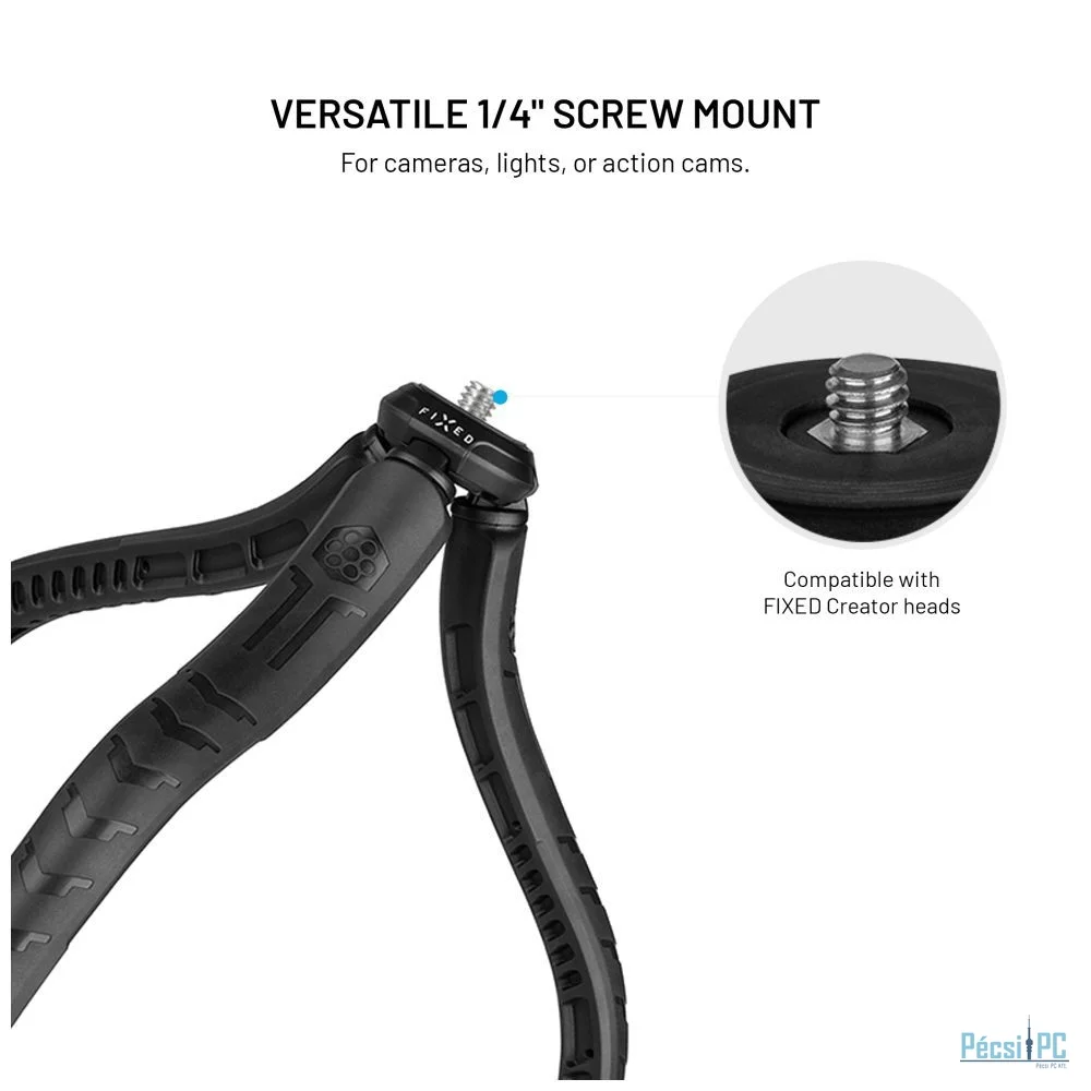 A rugalmas FIXED Creator állvány ideális segítője a fényképezésnek, filmezésnek és streamingnek bárhol a terepen vagy otthon. Lábai hét acélszállal vannak megerősítve, amelyek tetszés szerint hajlíthatók, vagy biztonságosan körbetekerhetők ágak, korlátok vagy oszlopok körül. Így még a nem szokványos helyeken is könnyedén elkészítheti a tökéletes felvételt. A gumírozott felület maximális stabilitást biztosít, és megakadályozza a csúszást a sima felületeken. Az állványhoz tartozik egy állítható tartó, amely akár 6,9" méretű telefonok tartására is alkalmas, és amely megvédi a bilincs belső párnázatát a karcolásoktól. A forgócsuklónak köszönhetően a tartó vízszintes vagy függőleges helyzetbe állítható a legjobb szögben. A tartó két praktikus hidegcipő-adapterrel is rendelkezik mikrofon vagy LED-lámpa rögzítéséhez. A tartó eltávolítása után az univerzális 1/4"-os menetet használhatja a kompatibilis fényképezőgépek, akciókamerák vagy más tartozékok rögzítéséhez. Kompakt méreteinek és kis súlyának köszönhetően univerzális állvány mindenkinek, aki bárhol és korlátozások nélkül szeretne kreatív felvételeket készíteni.