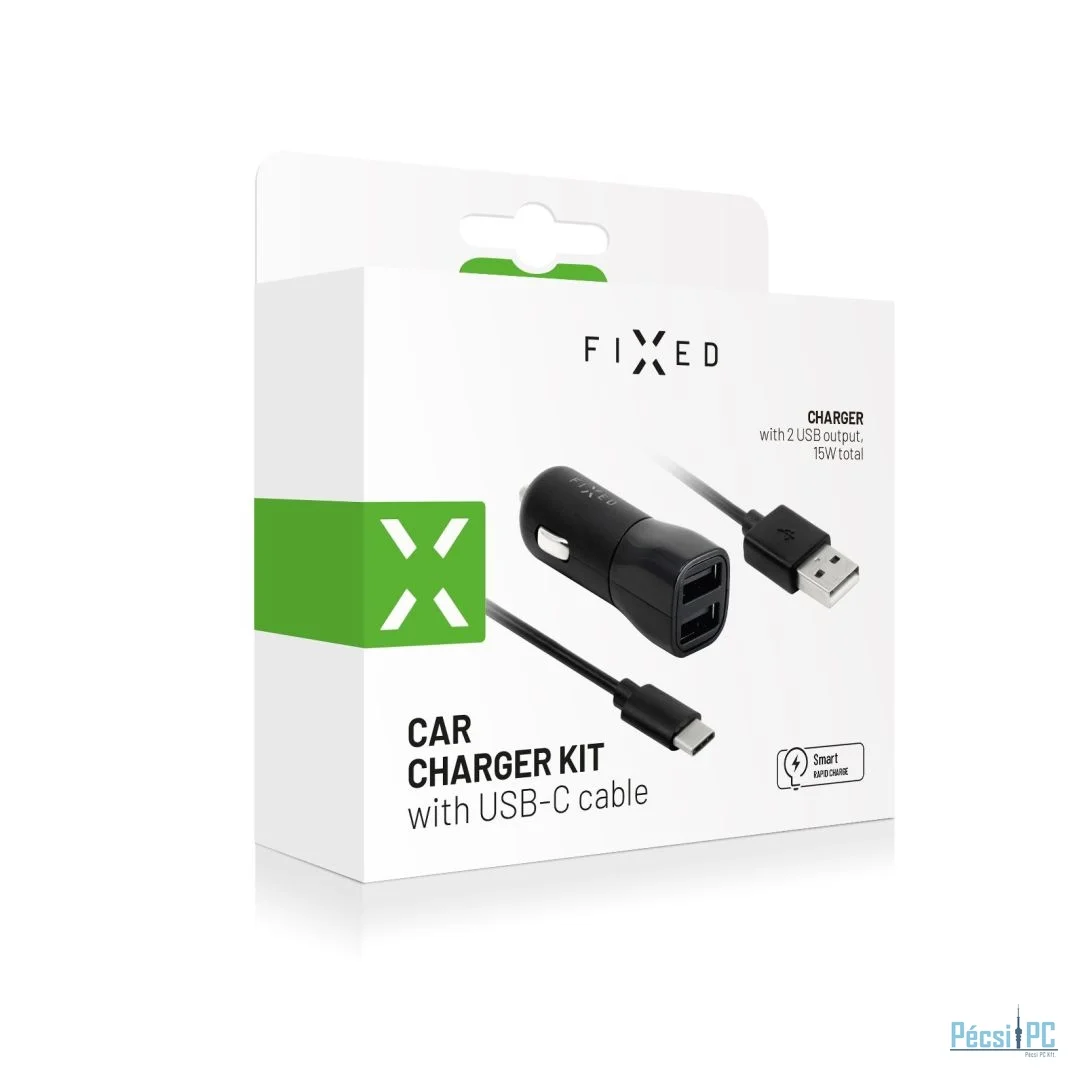FIXED USB csatlakozós autós töltő 15W+USB/USB-C kábel, fekete