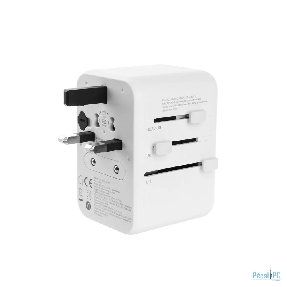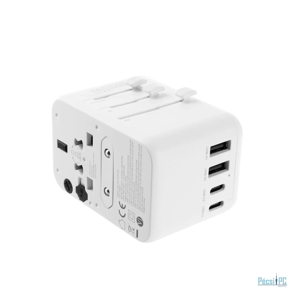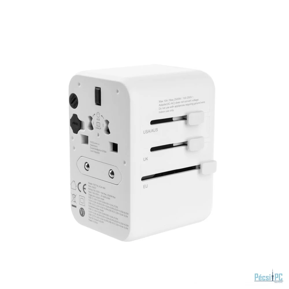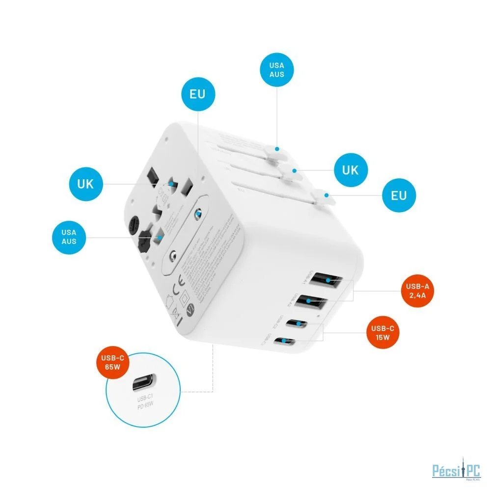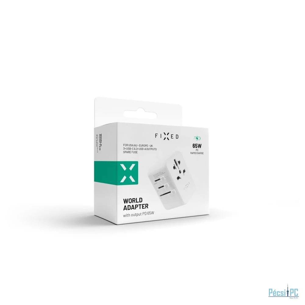 FIXED Utazóadapter EU, UK és USA/AUS számára 3xUSB-C és 2xUSB kimenettel, GaN PD 65W, fehér