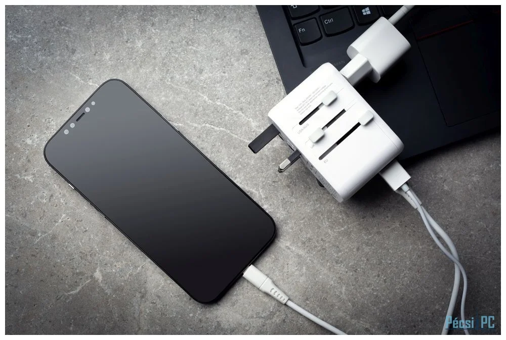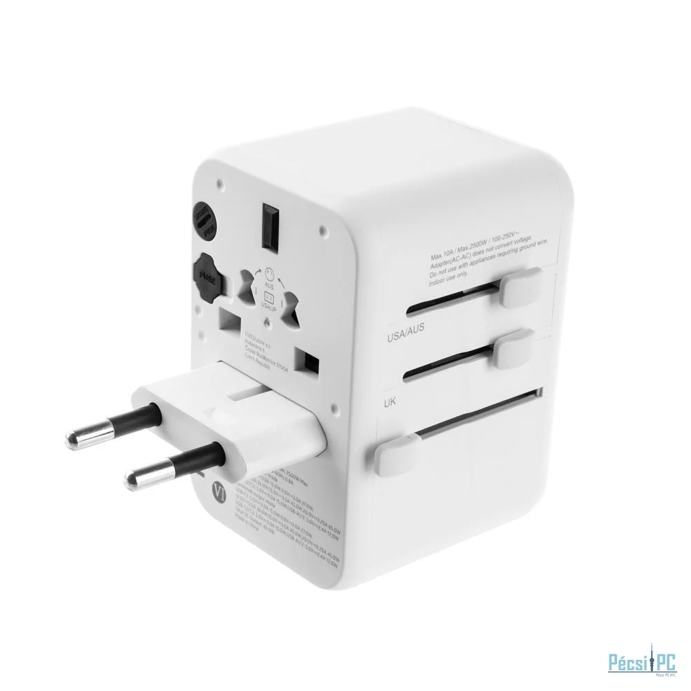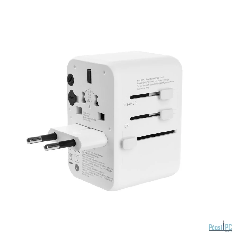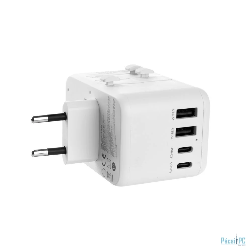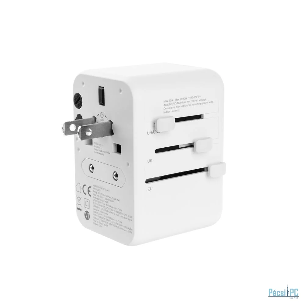 FIXED Utazóadapter EU, UK és USA/AUS számára 3xUSB-C és 2xUSB kimenettel, GaN PD 65W, fehér