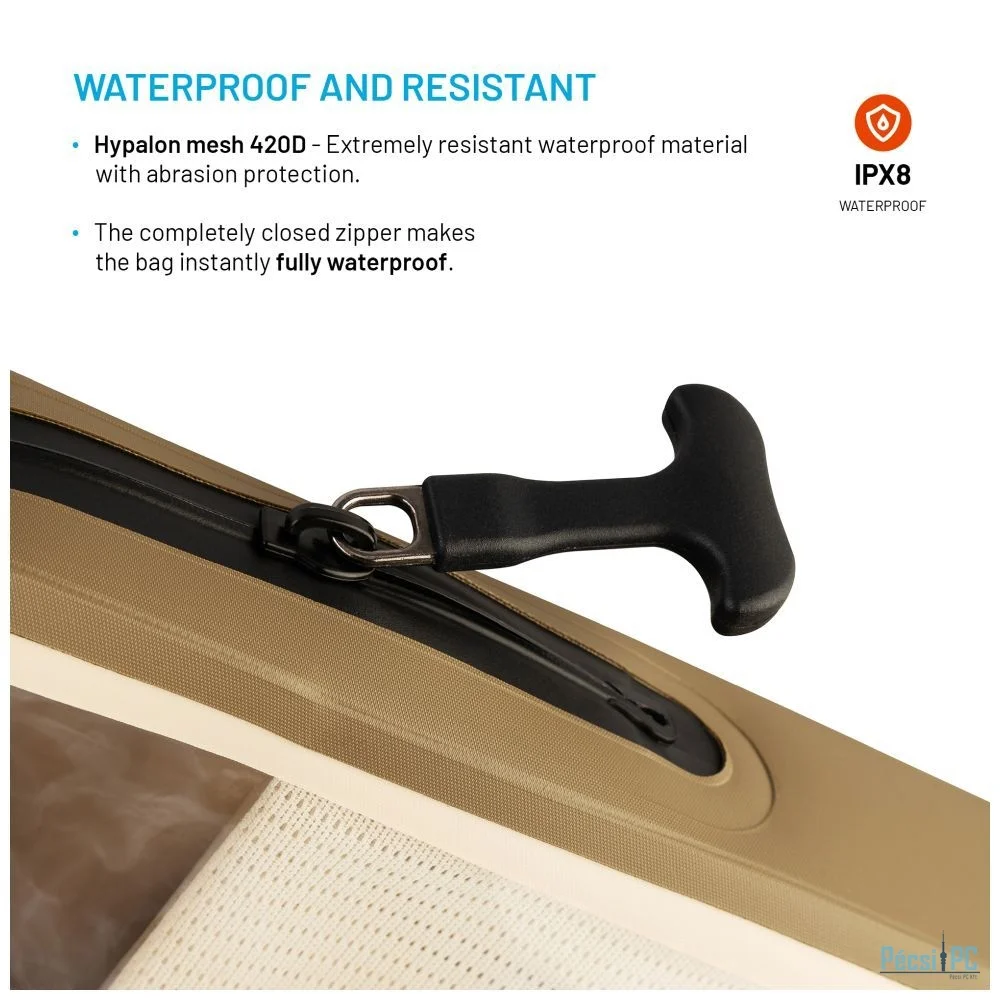 A kompakt, vízálló FIXED Dry Case tok megvédi személyes tárgyait a nedvességtől, homoktól vagy szennyeződésektől a szabadtéri tevékenységek során vagy a vízparton. A főzseb elegendő helyet biztosít minden lényeges dolognak, beleértve a legfeljebb 7" képátlójú telefont is, amelyet egy belső hálós zseb biztonságosan elválaszt a többi dologtól. Az átlátszó érintős részek biztosítják, hogy mindig áttekintheti a tartalmat, miközben kényelmesen vezérelheti telefonját anélkül, hogy azt ki kellene vennie a tokból. A felhasznált Hypalon hálós 420D anyag rendkívül ellenálló a vízzel, a kopással és a szakadással szemben, így a tok élettartama nagy igénybevétel esetén is meghosszabbodik. A biztonságos zárást vízálló cipzár biztosítja, amelyet csak szorosan meg kell húznod, és a tok azonnal lezárul. Az IPX8 minősítésnek köszönhetően még akkor is megvédi a tartalmát, ha akár 5 méteres mélységig, egy órán keresztül merül el. A kényelmes viselet érdekében a táska egy állítható, akár 145 cm hosszúságú pánttal van ellátva, amelyet könnyedén az Ön igényeihez igazíthat.