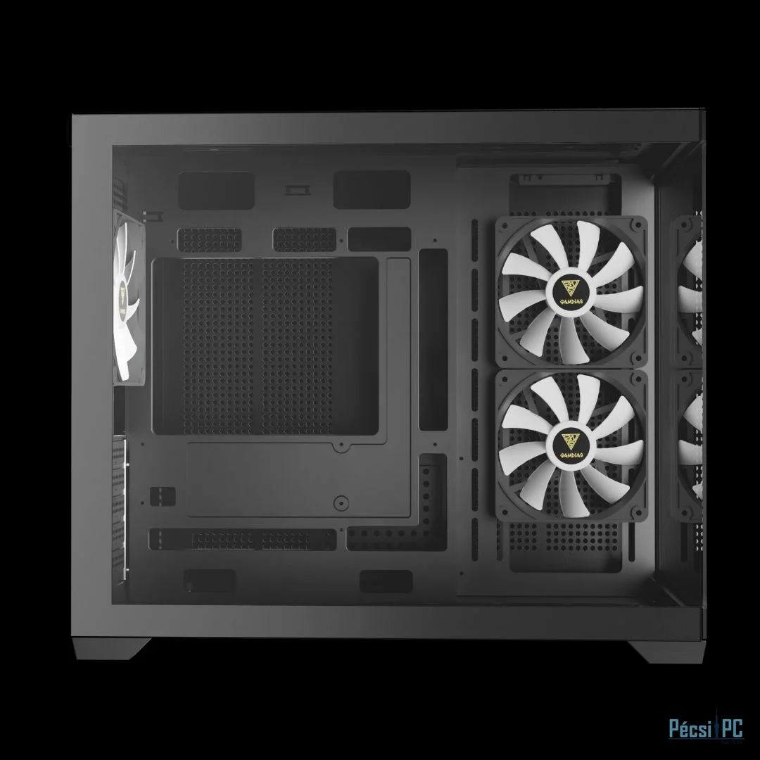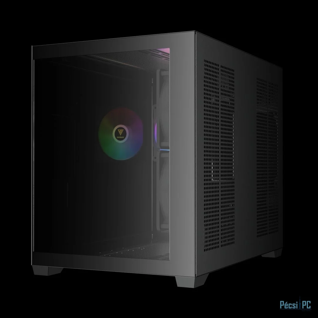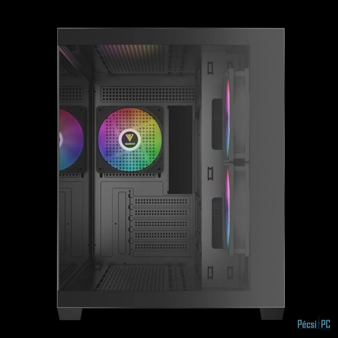 microATX, Black, 1x3,5", 3x2,5", 1xUSB2.0, 1xUSB Type-C, Audio, Táp nélkül, 420x365x285mm, Ventilátor:3x12cm, Tempered glass window, RGB, Gamer