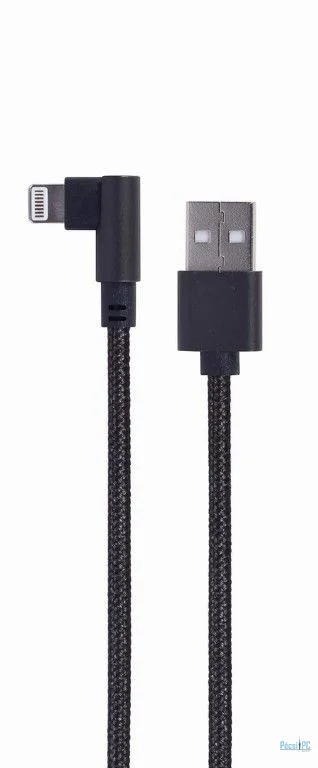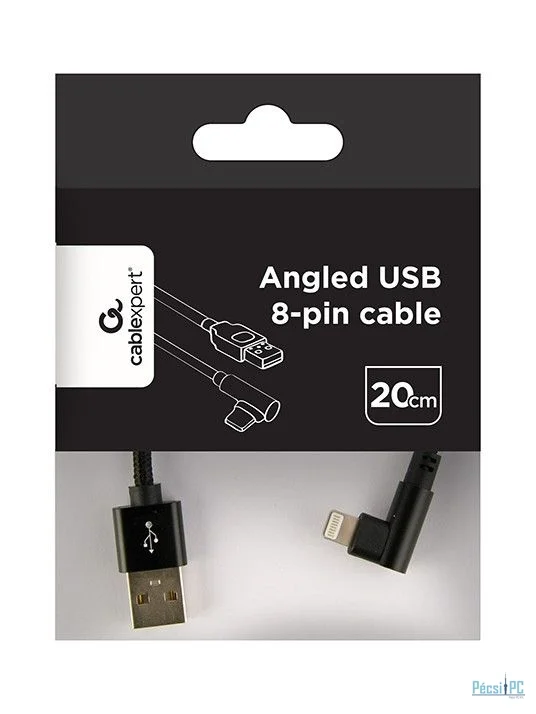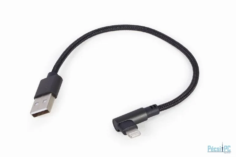 USB kábel, USB-A, Lightning, USB2.0, Male/Male, 0,2m, Black, Töltő és adatkábel, 90 fokos, Szövetborítás