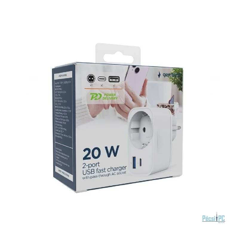 Gembird TA-ACPDQC20-01-W 2-port USB fast charger with pass-through AC socket 20W White