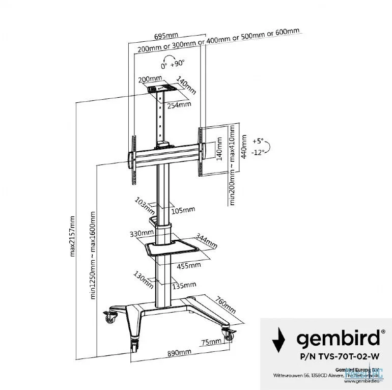 Gembird TVS-70T-02-W Aluminum TV floor stand with caster wheels 37"-70" White