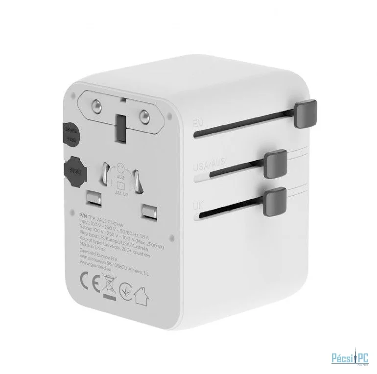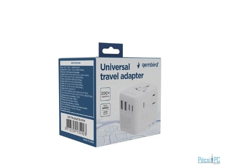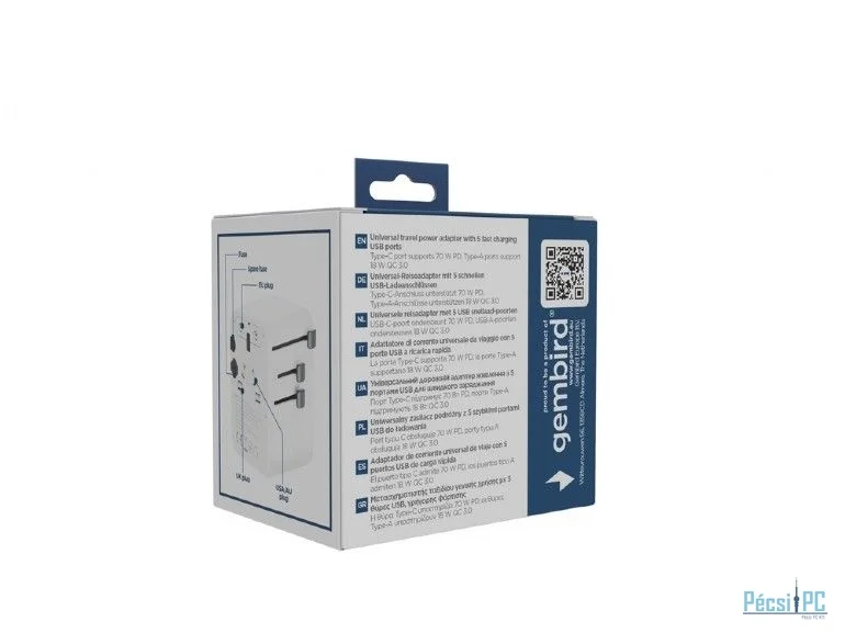 Adapter, 2xUSB-A, 3xUSB-C, 5V/9V/12V/15V, 3A, 70W, QC, PD, White