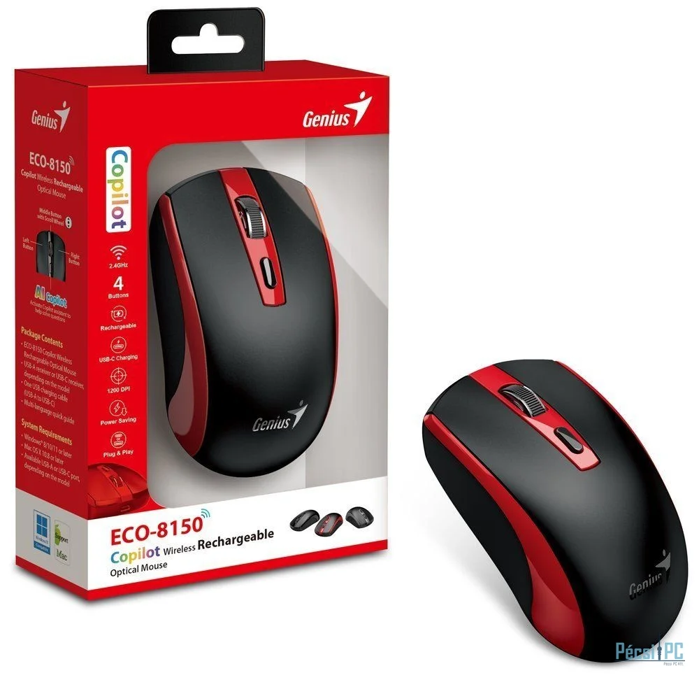Vezeték nélküli, Wireless 2,4GHz, Optikai, 1200DPI, Black/Red, Újratölthető