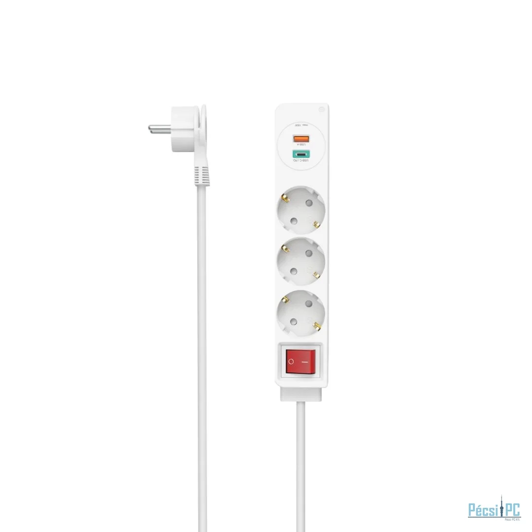 Elosztó, 3xDIN, 1,4m, Kapcsoló, USB, White
