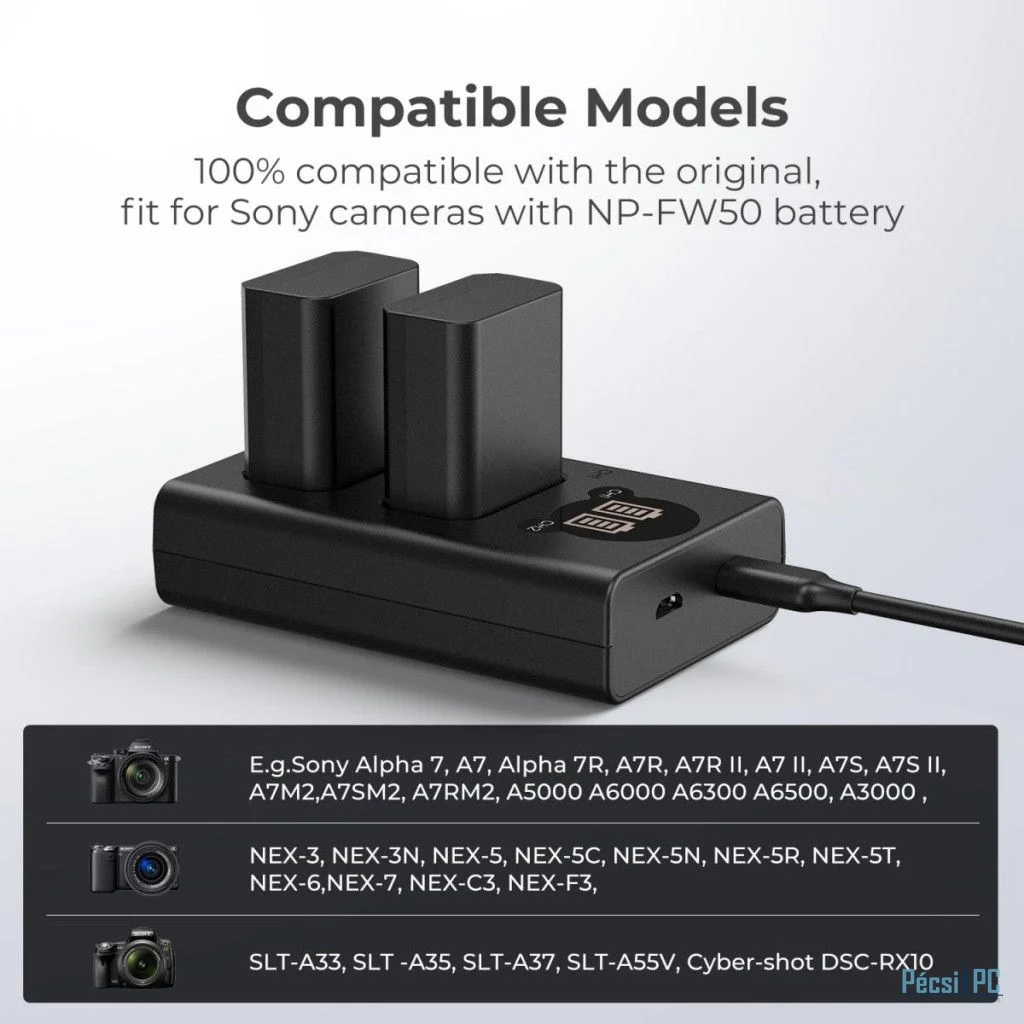 - Kompatibilitás: NP-FW50 akkumulátorral rendelkező Sony fényképezőgépekhez (pl. Alpha A6000, A6100, A6300, A6400, A6500, A7, A7 II, A7R, A7R II, A7S, A7S II, RX10 stb.)