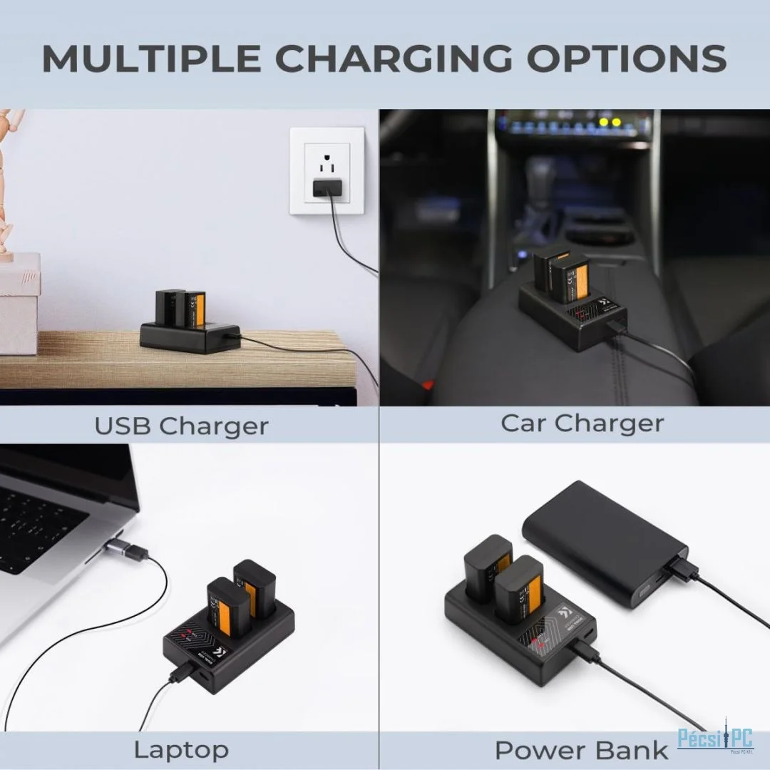Kompatibilitás: Az eszköz olyan gyakran használt Type-C és Micro USB interfészeket használ, ami kényelmesebb használatot tesz lehetővé. Kompatibilis az NP-FW50 fényképezőgép akkumulátorokkal és a felsorolt fényképezőgép modellekkel: Sony Alpha 7, A7, Alpha 7R, A7R, A7R II, A7 II, A7S, A7S II, A7M2, A7SM2, A7RM2, A5000 A6000 A6300 A6500, a3000, NEX-3, NEX-3N, NEX-5, NEX-5C, NEX-5N, NEX-5R, NEX-5T, NEX-6, NEX-7, NEX-C3, NEX-F3, SLT-A33, SLT-A35, SLT-A37, SLT-A55V, Cyber-shot DSC-RX10, stb.