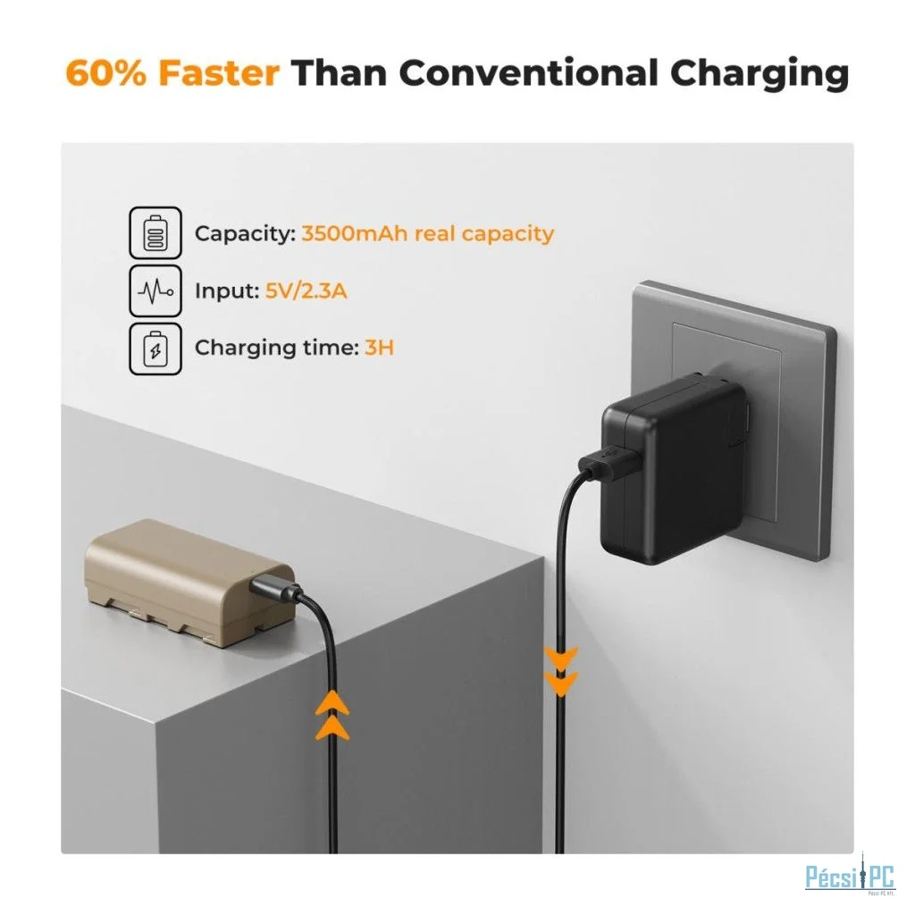 USB-C gyors töltés: Ez az NP-F550 akkumulátor USB Type-C nagyáramú töltőporttal rendelkezik (5V/2.3A), amely 3 órán belül teljesen feltölti az akkumulátort; a töltési idő 60%-kal csökken a hagyományos töltéshez képest.