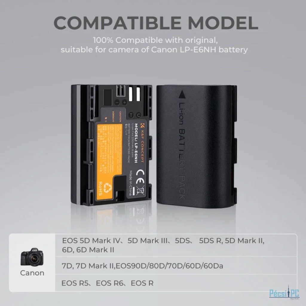 A K&F Concept LP-E6NH egy megbízható, nagy kapacitású lítium-ion akkumulátor, amely tökéletesen illeszkedik a Canon LP-E6, LP-E6N és LP-E6NH akkumulátorokat használó fényképezőgépekhez. A 2250mAh kapacitás hosszú üzemidőt biztosít, így kiváló választás fotósoknak és videósoknak, akik biztos energiaellátást keresnek stúdió- vagy kültéri munkához.