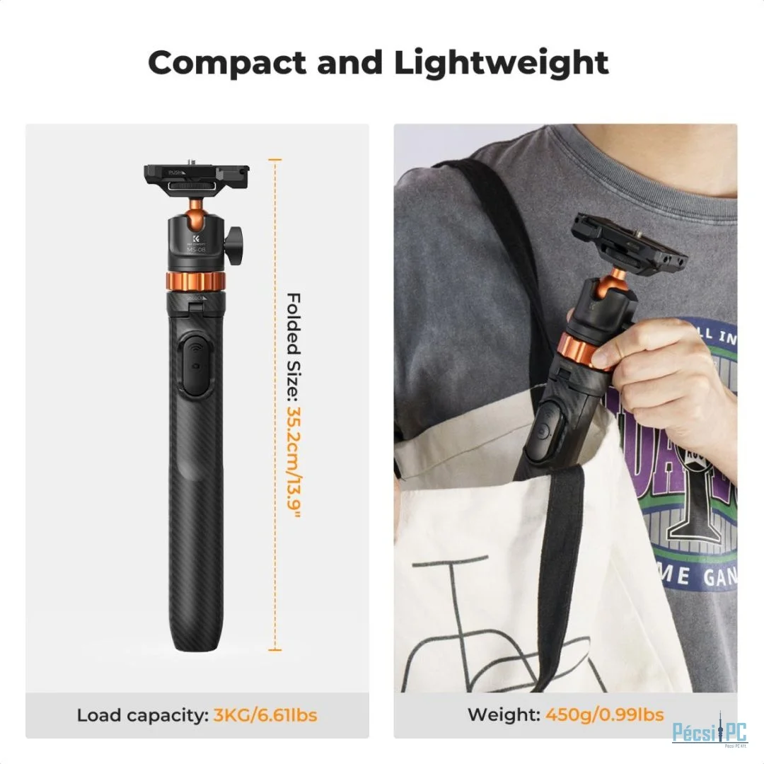 A maximális magasság eléri a 157,8 cm-t, és támogatja a 7 szakaszos lábbeállítást. Tetszés szerint állíthatja be a kívánt magasságot. Ez az állványfej 3 kg teherbírást támogat, és megfelel a legtöbb tükör nélküli fényképezőgép, mobiltelefon és egyéb felszerelés igényeinek. GoPro adapterrel felszerelve a GoPro, DJI Osmo Action és Insta 360 készülékek felvételi igényeihez igazítható. legjobb telefonos szelfibot A gömb alakú fej vízszintesen 360 fokban forgatható és függőlegesen 90 fokban dönthető, így lehetővé teszi a teljes körű felvételkészítést. Akár tájképeket, embereket vagy sportjeleneteket készít, könnyedén rögzítheti a kívánt szöget és látómezőt. A tetején található egy 1/4 hüvelykes csatlakozó, amely bármilyen eszközhöz csatlakoztatható a felvételek készítéséhez és támogatásához. A mindössze 97 g-os súlya miatt könnyen hordozható, és alkalmas utazáshoz és kültéri felvételek készítéséhez. Ingyenes Bluetooth távirányítót biztosítunk, amely jelszó nélkül gyorsan párosítható, és 10 méteres körzetben szabadon fényképezhet vagy videót rögzíthet. Folyamatosan 10 órán keresztül képes működni. Megjegyzés: A bluetooth távirányító csak mobiltelefonokhoz csatlakoztatható, fényképezőgépekhez nem.