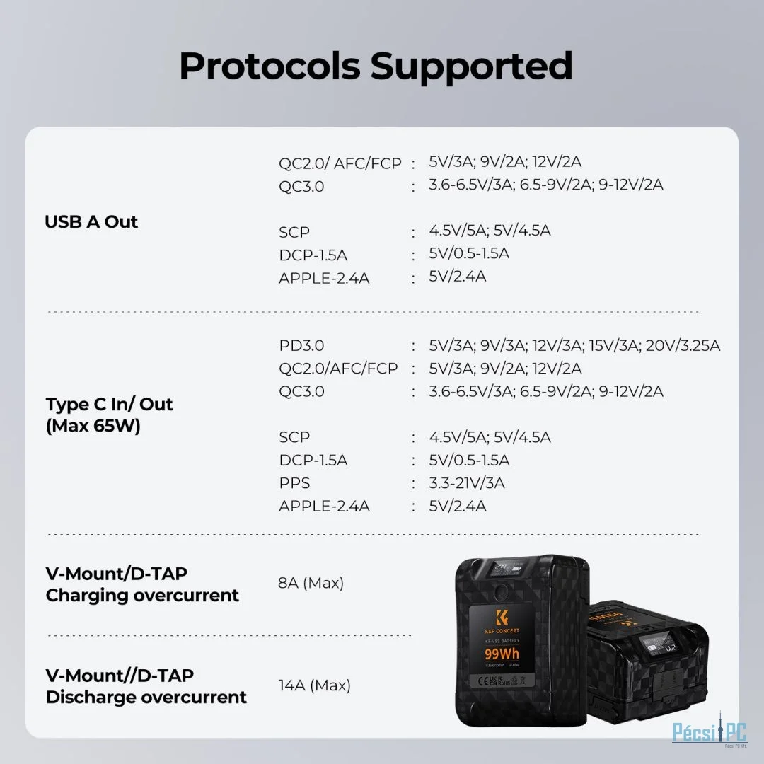 K&F Concept V-Mount akkumulátor, 99Wh, 14.8V, 6700mAH, PD65W, oled kijelző