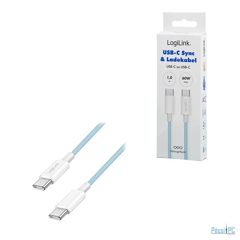 USB kábel, USB-C, USB-C, USB2.0, Male/Male, 1m, Blue, Töltő és adatkábel, Szövetborítás