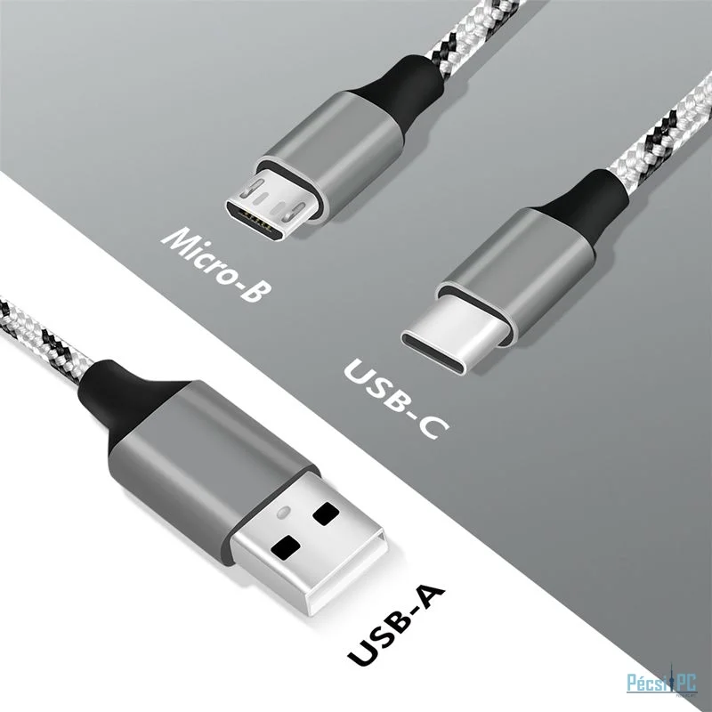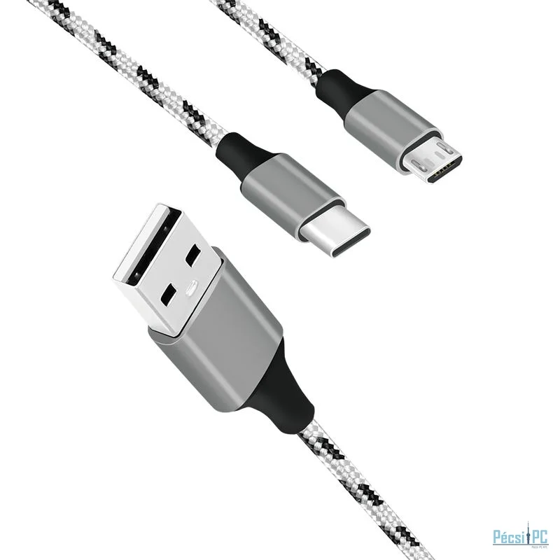 USB kábel, USB-A, microUSB/USB-C, USB2.0, Male/Male, 1,2m, Black/White, Töltő és adatkábel, Szövetborítás