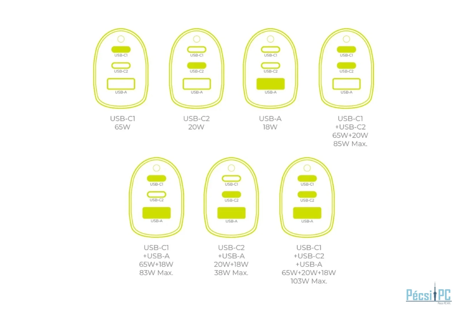 Teljes terhelés és a teljes 100 W teljesítmény felhasználása mellett is a töltés biztonságos és stabil marad. Az integrált intelligens chipek folyamatosan figyelik a hőmérsékletet, és szükség esetén szabályozzák az áramellátást, megvédve mind a töltőt, mind az összes csatlakoztatott eszközt a károsodástól. A töltőn lyukak találhatók a hőelvezetéshez töltés közben.