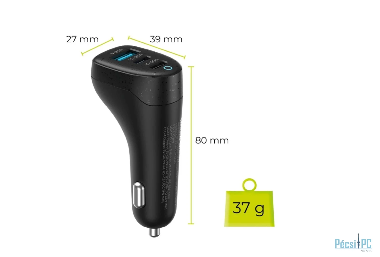 Felejtse el a lassú töltést az autóban. Ez a kicsi fekete töltő a modern USB Power Delivery 3.0 (PD 3.0) technológiának köszönhetően akár 100 W (2x USB-C + USB-A egyszerre) valódi teljesítményt biztosít.