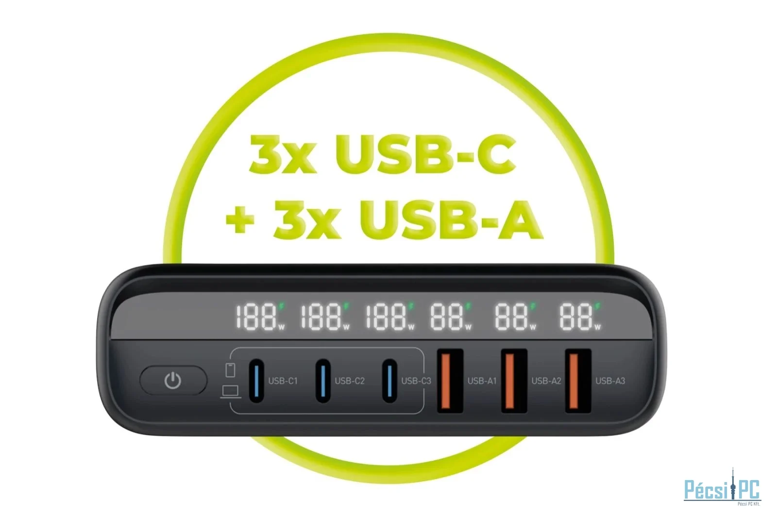 Adapter, 3xUSB-A, 3xUSB-C, 5V/9V/12V/15V/20V, 5A, 140W, QC, PD, Black