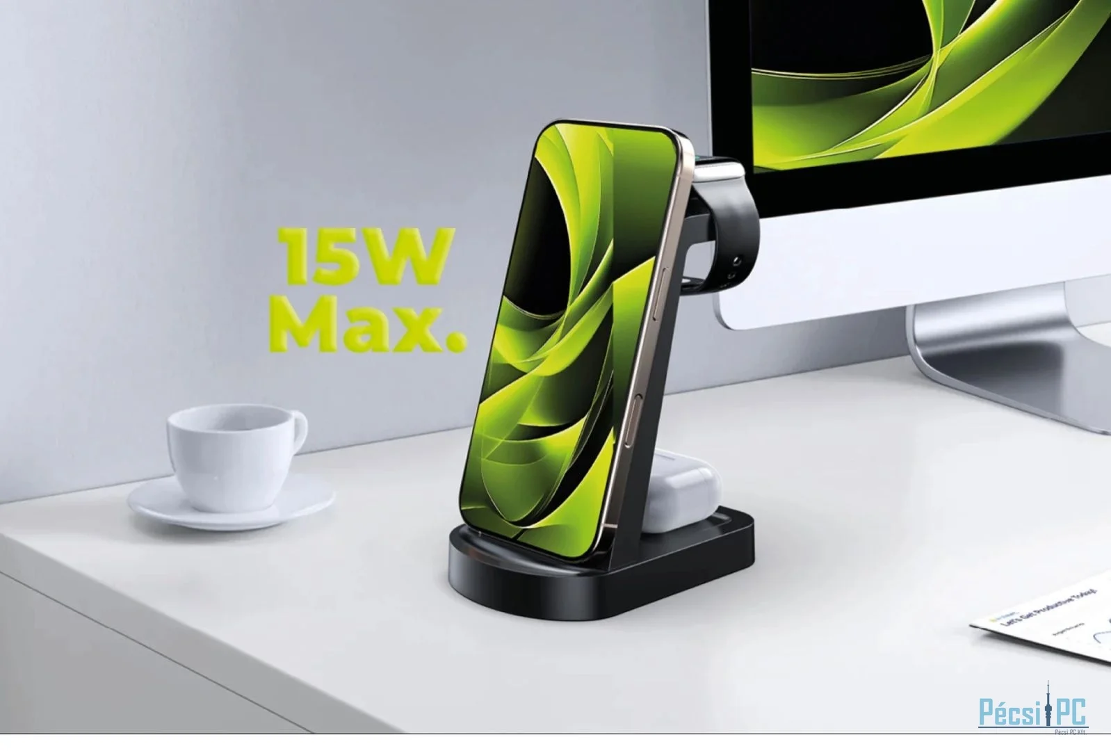 Ismerd meg a PW14 vezeték nélküli 3in1 töltőt - egy nagyszerű töltőállvány az Apple készülékek tulajdonosai számára. Egyszerre tölti az iPhone-t, az Apple Watch-ot és az AirPods-t egyetlen kábellel. Intelligens töltést biztosít túlmelegedés, túlfeszültség, rövidzárlat és túlterhelés elleni védelemmel, és lehetővé teszi a portré és a tájoló tájolást is, így töltés közben videókat nézhetsz.