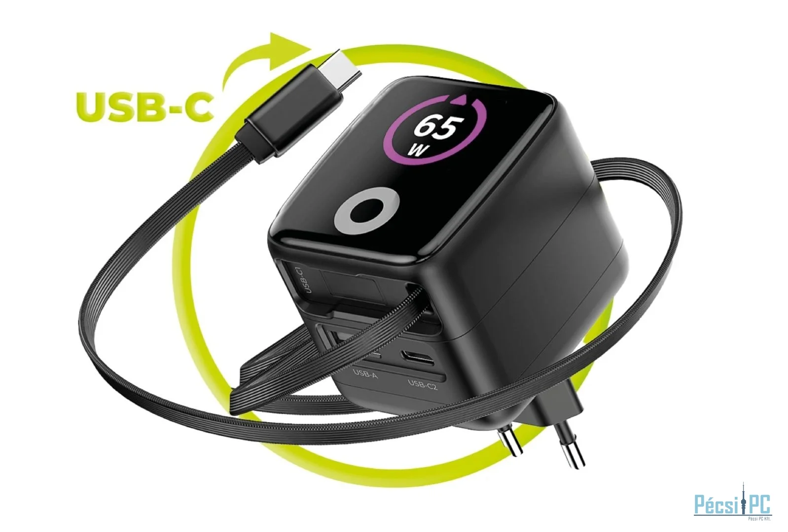 3 kimenet - 1x beépített USB-C kábel, 1x USB-C port, 1x USB-A port.