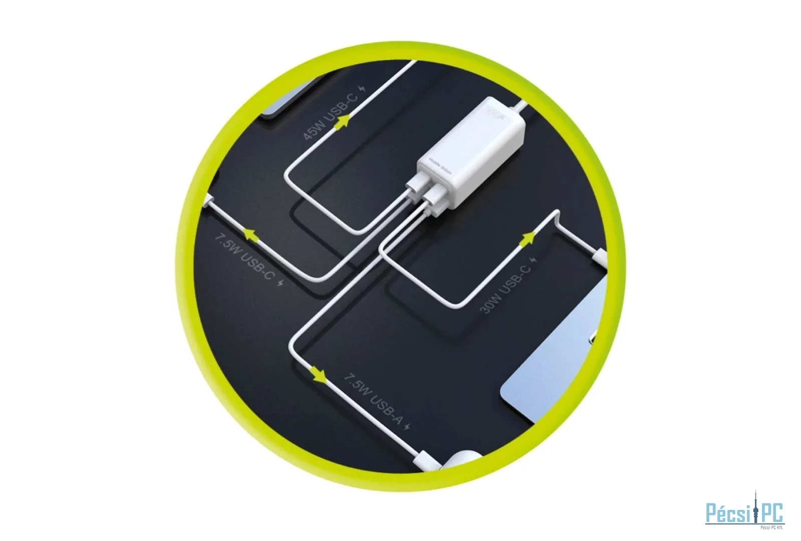 A 3× USB-C és 1× USB-A csatlakozóval egyszerre tölthet laptopot (45 W), táblagépet (30 W), okostelefont (7,5 W) és fejhallgatót (7,5 W) - gyorsan, hatékonyan és kompromisszumok nélkül.