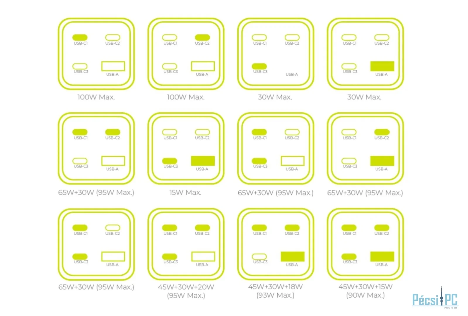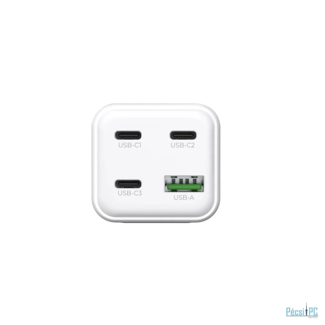 Négy portjának (3× USB-C + USB-A) köszönhetően ez a töltő rugalmas lehetőségeket kínál - a laptop gyors töltésétől kezdve a fejhallgató áramellátásáig.