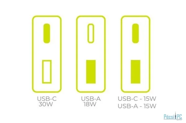 Maximális együttes teljesítmény két eszköz egyidejű töltésekor: USB-A (15W) és USB-C (15W).