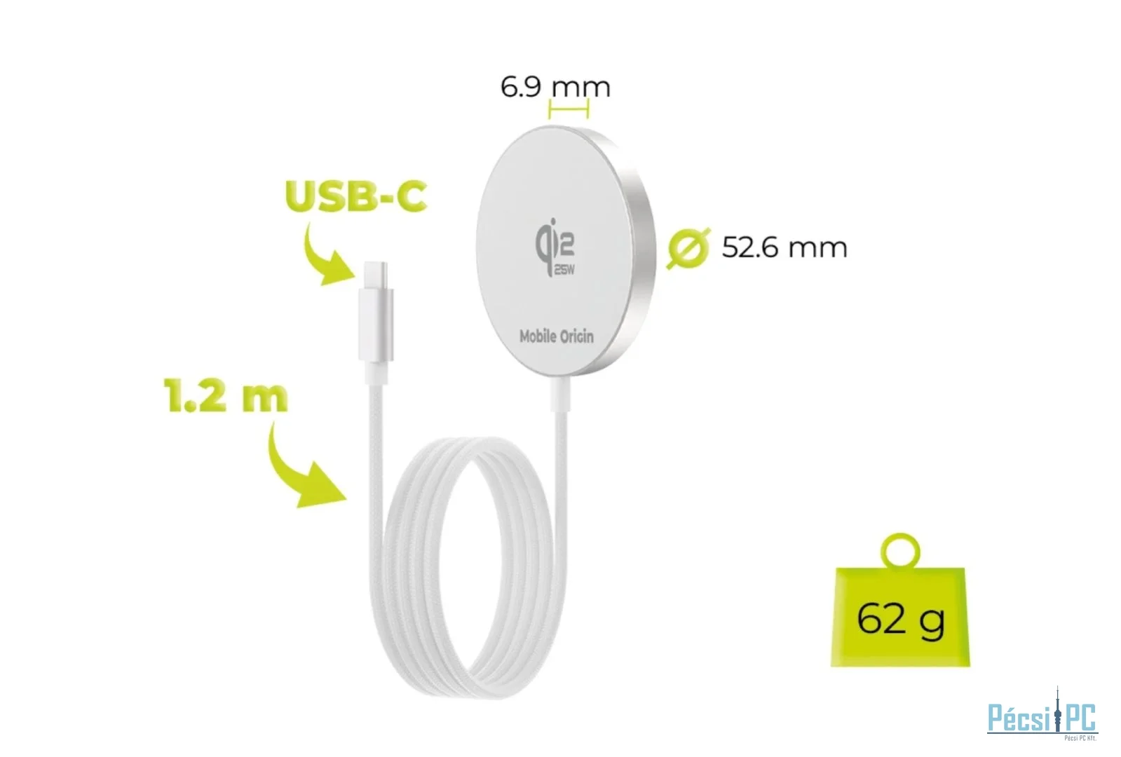 Ez a vezeték nélküli töltőpad kompakt méretei (52,6 x 52,6 x 6,9 mm) és súlya (62 g) ideális társává teszik mobil életmódjához. A kábel hossza 1,2 m.