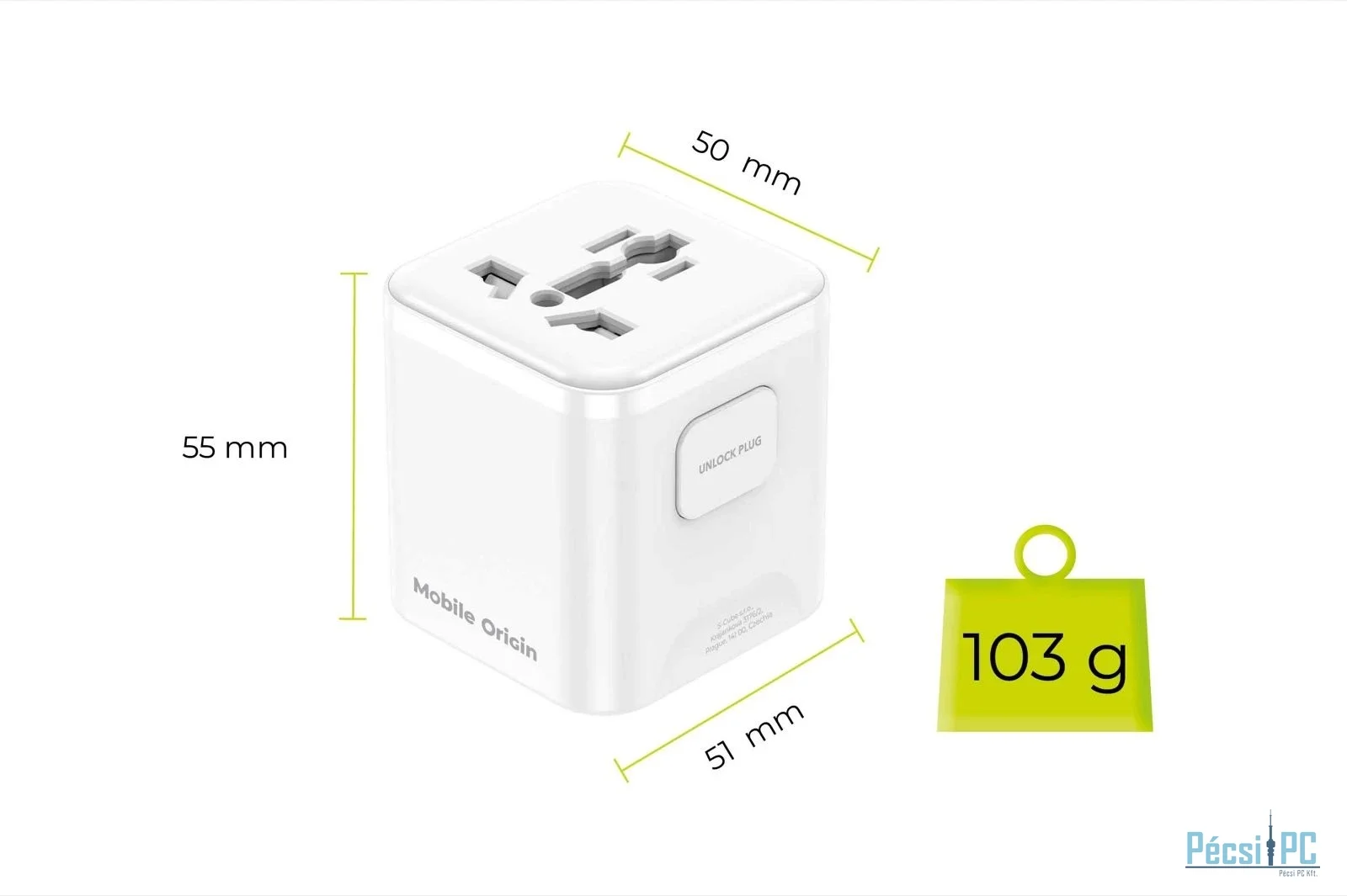 Az adapter mérete 55 x 51 x 50 mm, súlya pedig mindössze 103 gramm. Ezeknek a paramétereknek és a könnyű kialakításnak köszönhetően észre sem veszi, hogy a bőröndjében van.