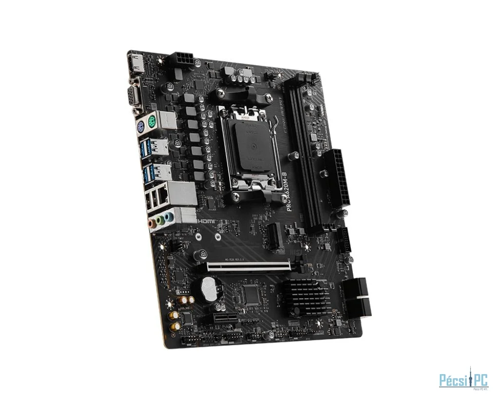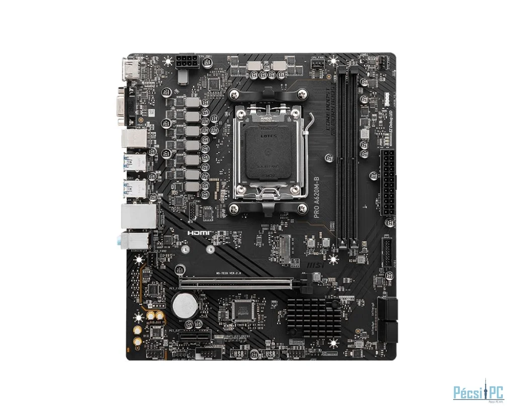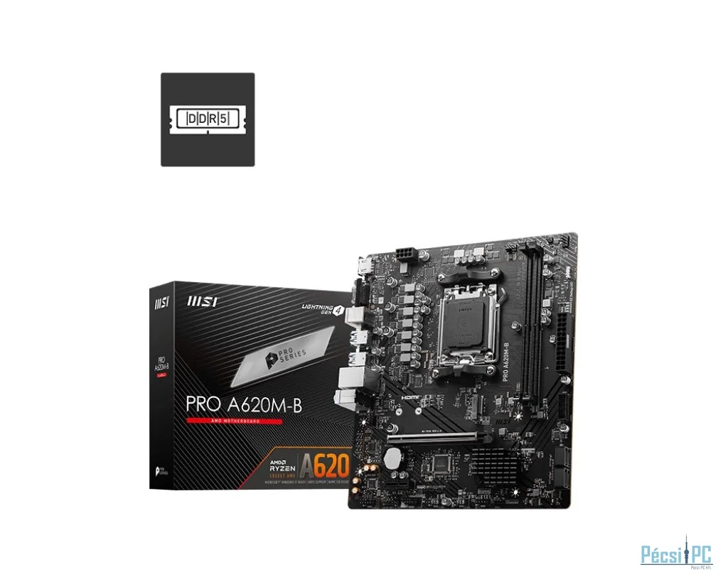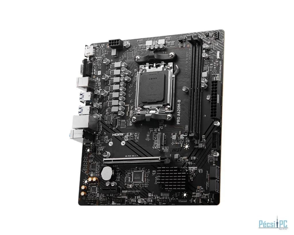 AM5, AMD A620, 2xDDR5, Max:4800MHz, Max:128GB, 1xPCIE16, 1xPCIE1, 4xSATA3, RAID, 2xUSB, 4xUSB3.2, VGA, HDMI, PS2:2 db, 7.1, Gigabit, 1xM.2, Micro-ATX