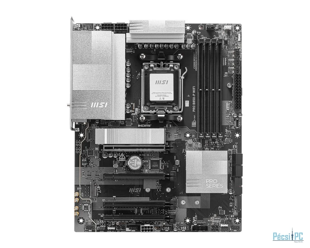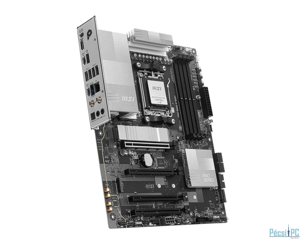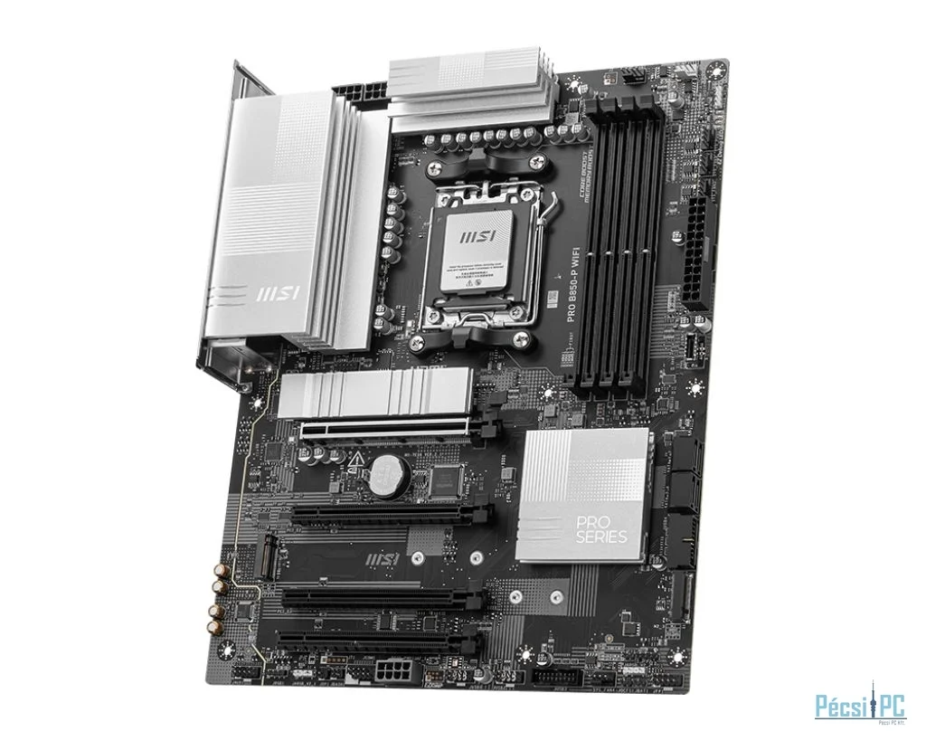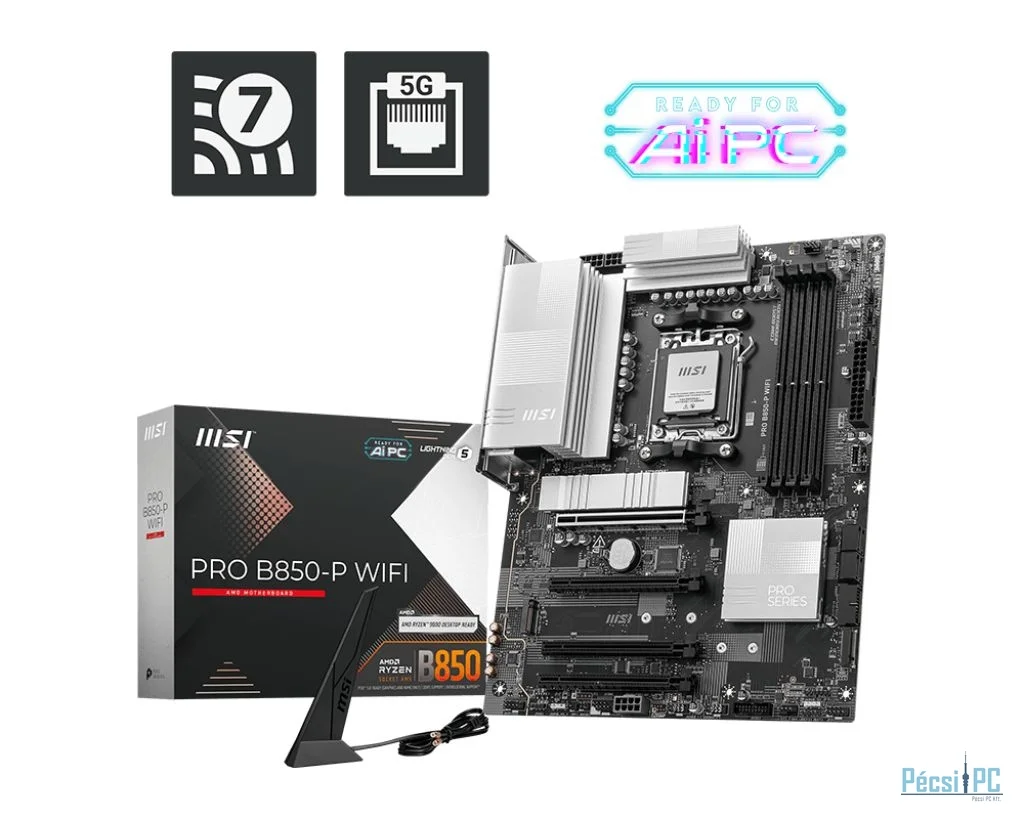 AM5, AMD B850, 4xDDR5, Max:5600MHz, Max:256GB, 4xPCIE16, 4xSATA3, RAID, 4xUSB, 1xUSB3, 1xUSB3.2, 2xUSB3.2C, HDMI, 7.1, SPDIF optikai kimenet, 5Gb/s LAN, WiFi, Bluetooth, 3xM.2, ATX