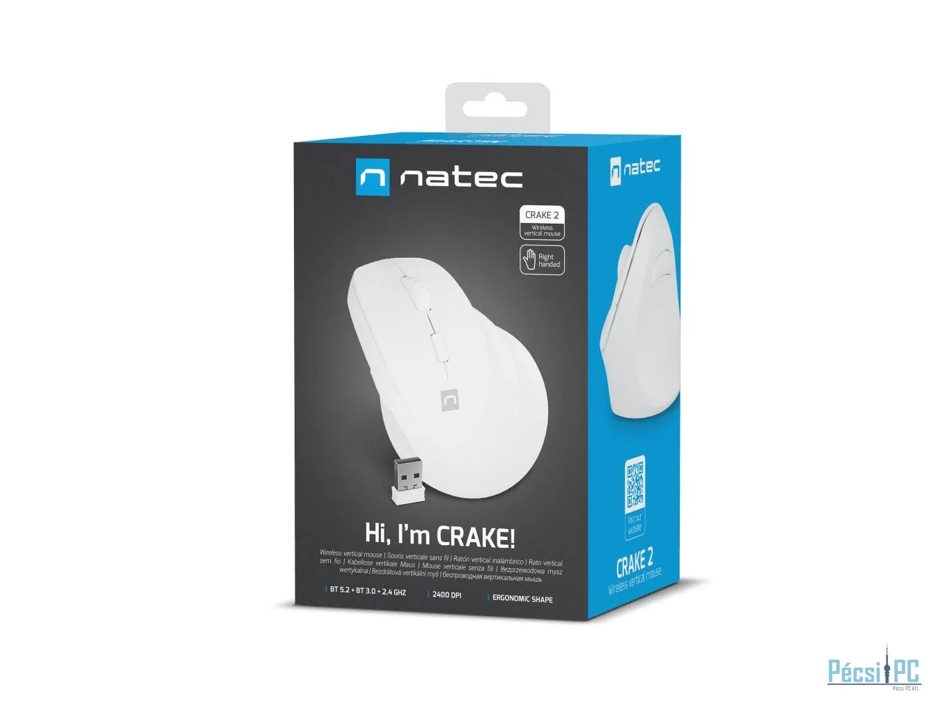 Vezeték nélküli, Wireless 2,4GHz, Bluetooth, Optikai, 2400DPI, White, Vertikális