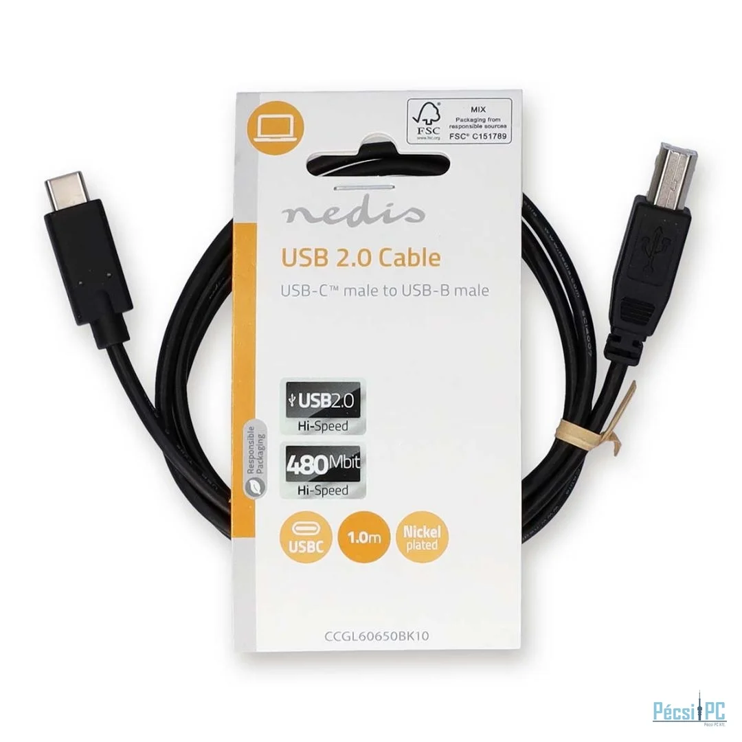 USB kábel, USB-C, USB-B, USB2.0, Male/Male, 1m, Black, Adatkábel